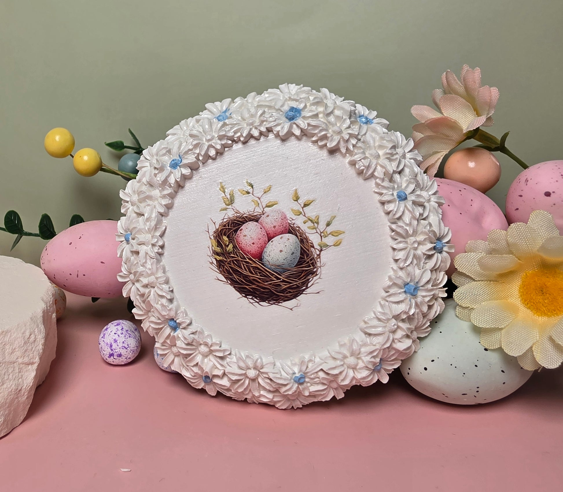 Der Oster-Rundteller ist eine handgefertigte Gipsplatte, die Frühling, Osterfreude und florale Eleganz in Ihr Zuhause bringt. Mit einem Durchmesser von 9 cm eignet sich dieser Teller perfekt als Dekoration, Schmuckteller oder kleines Servierstück.