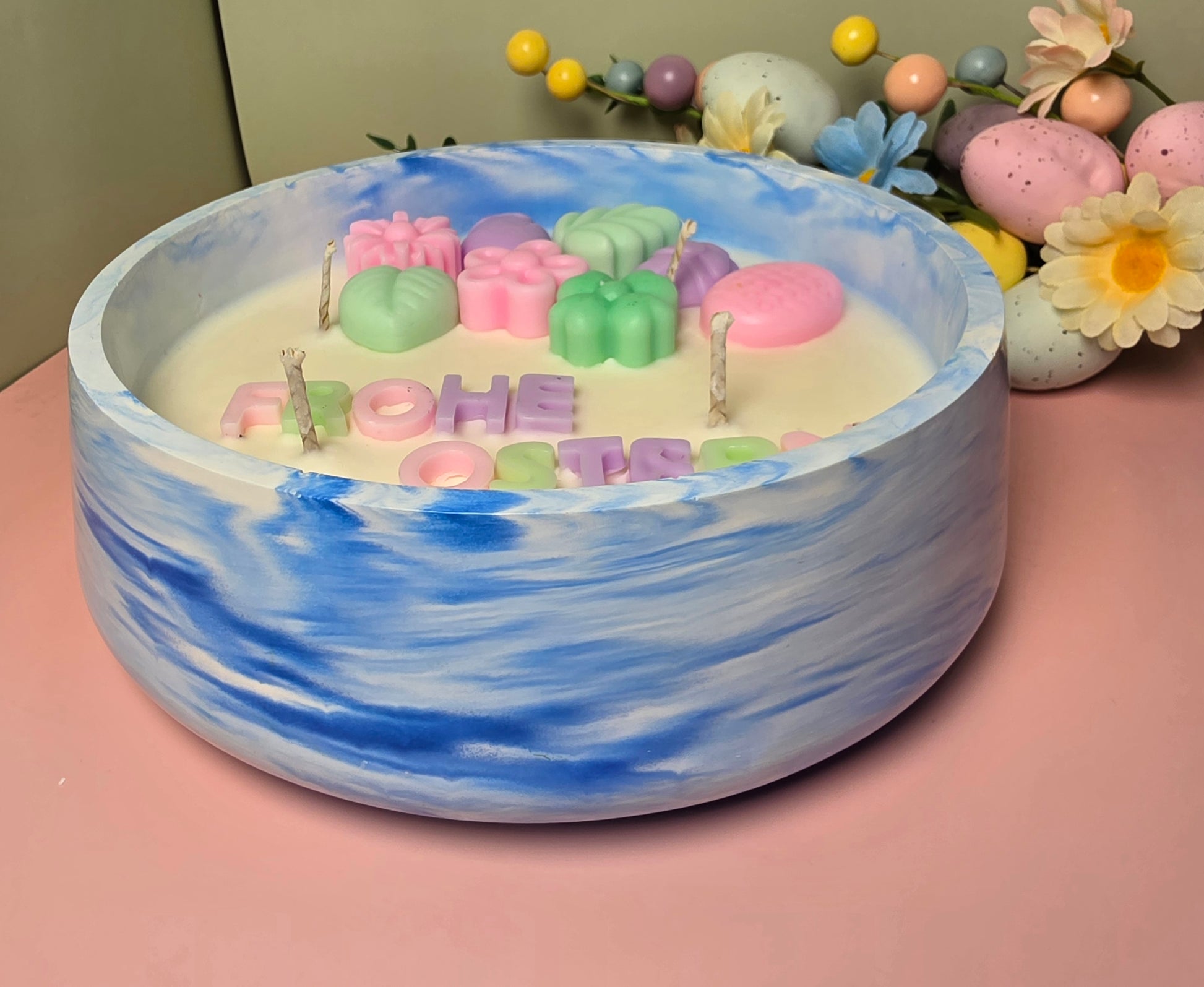 - Aufschrift „Frohe Ostern“ auf der Kerze