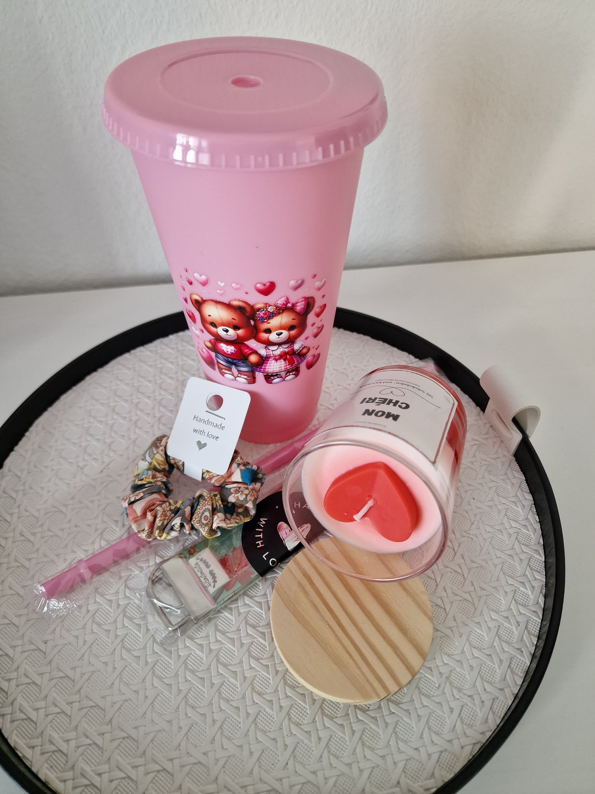 - 1 dekorierter rosa Plastikbecher – charmant & wiederverwendbar