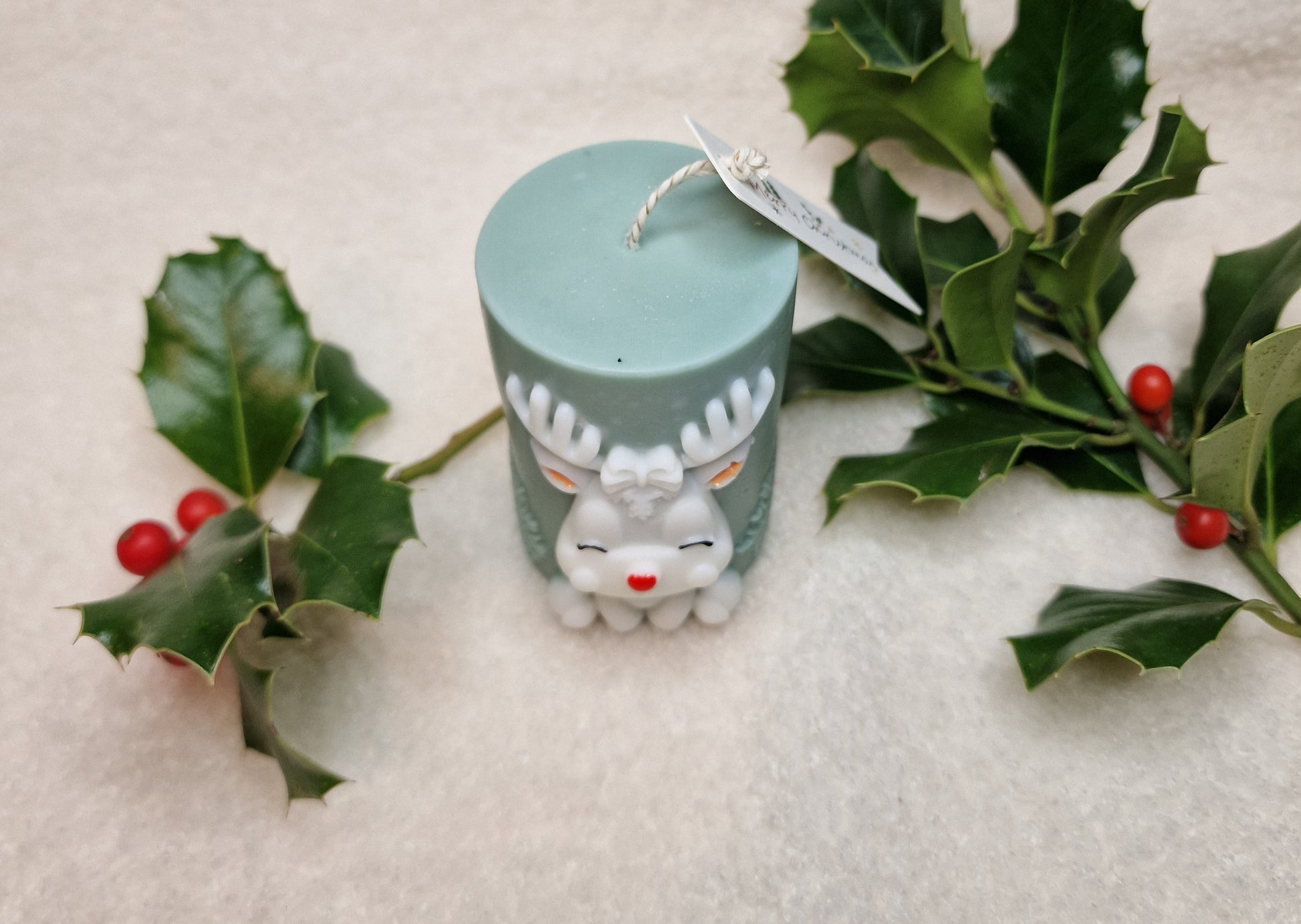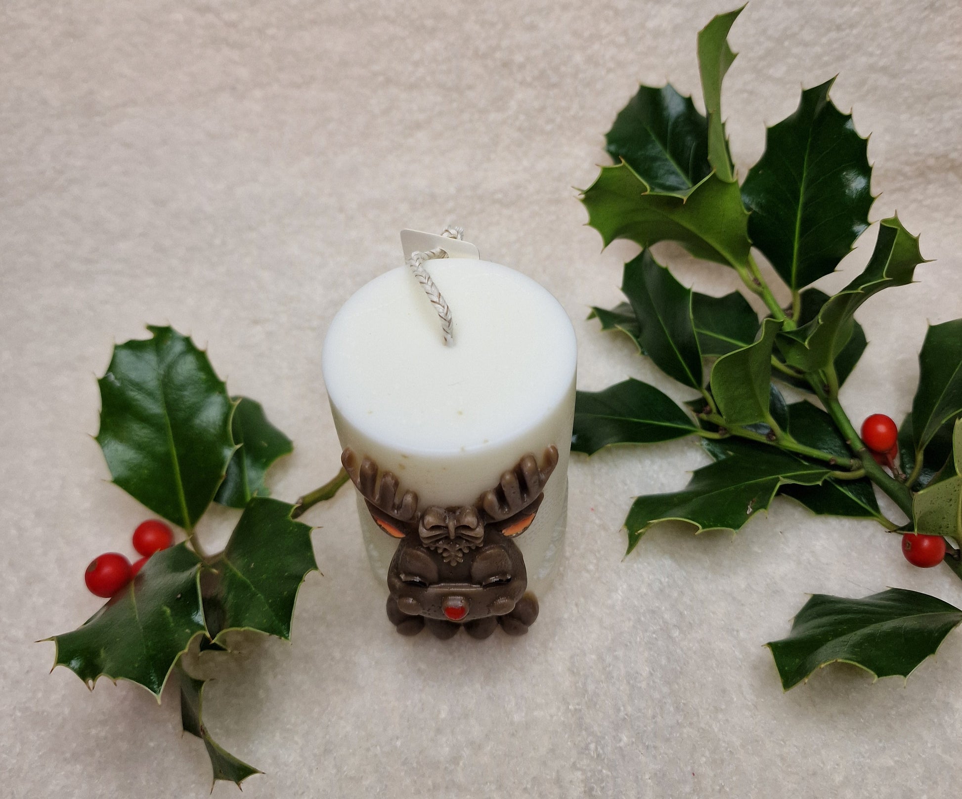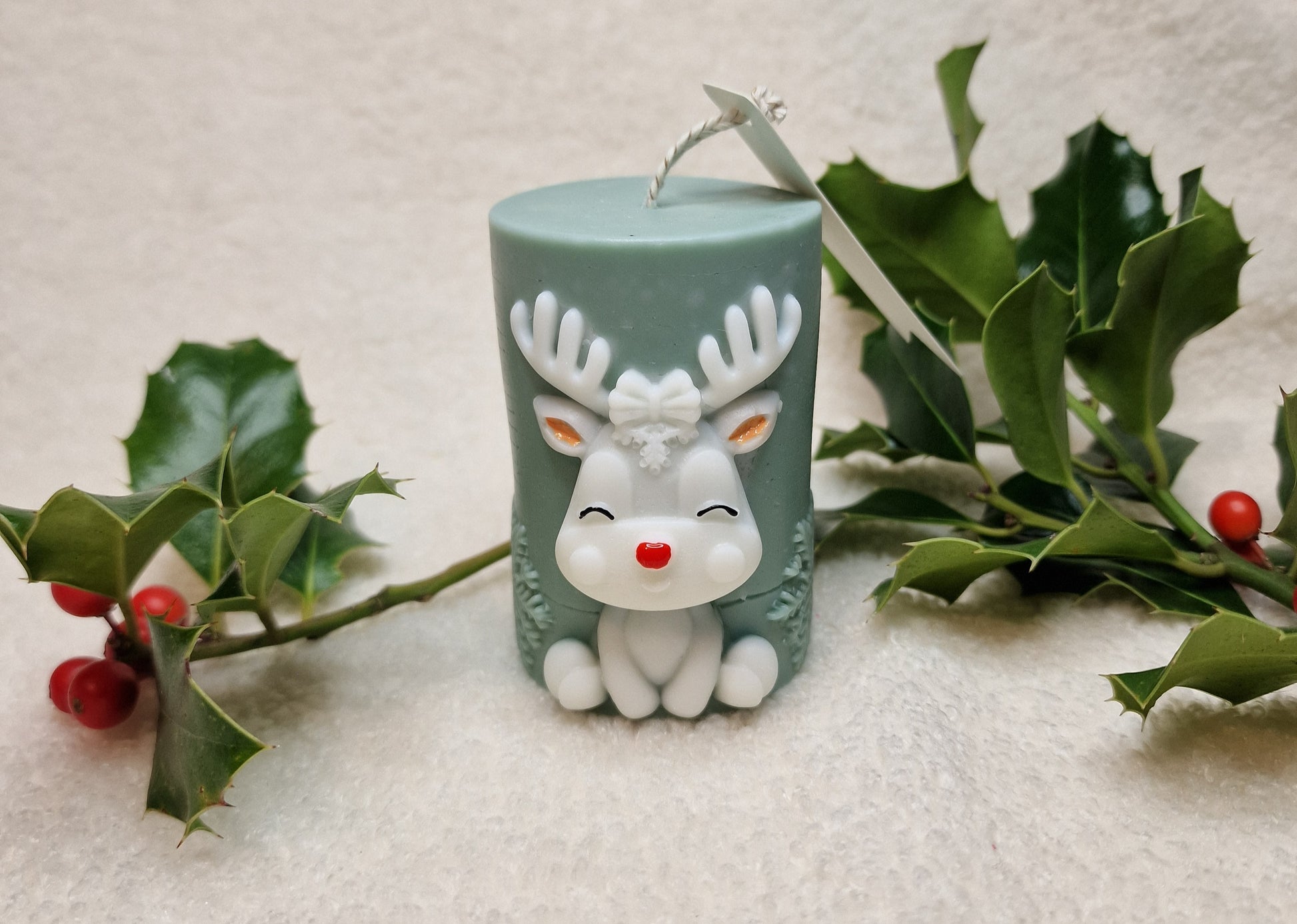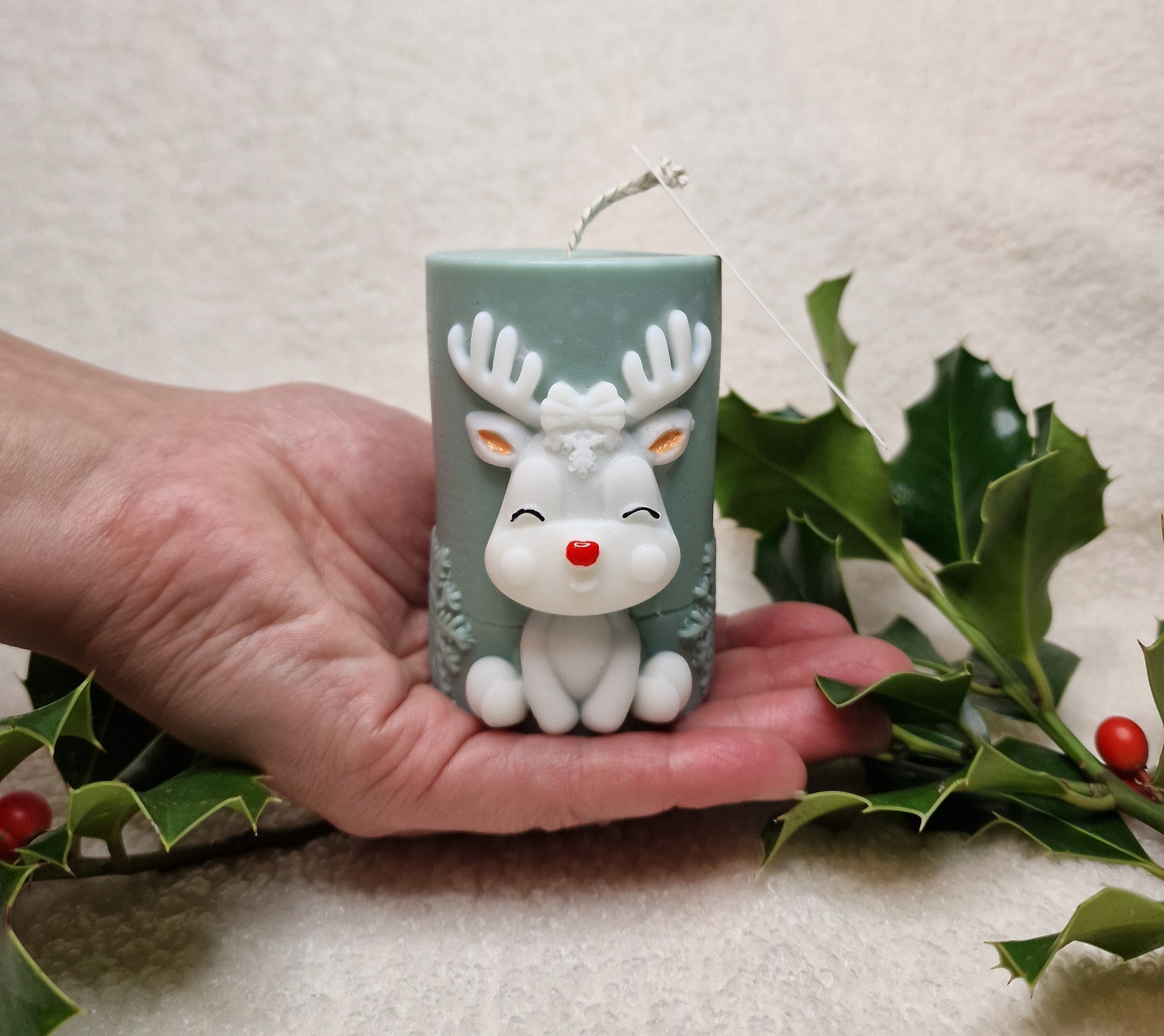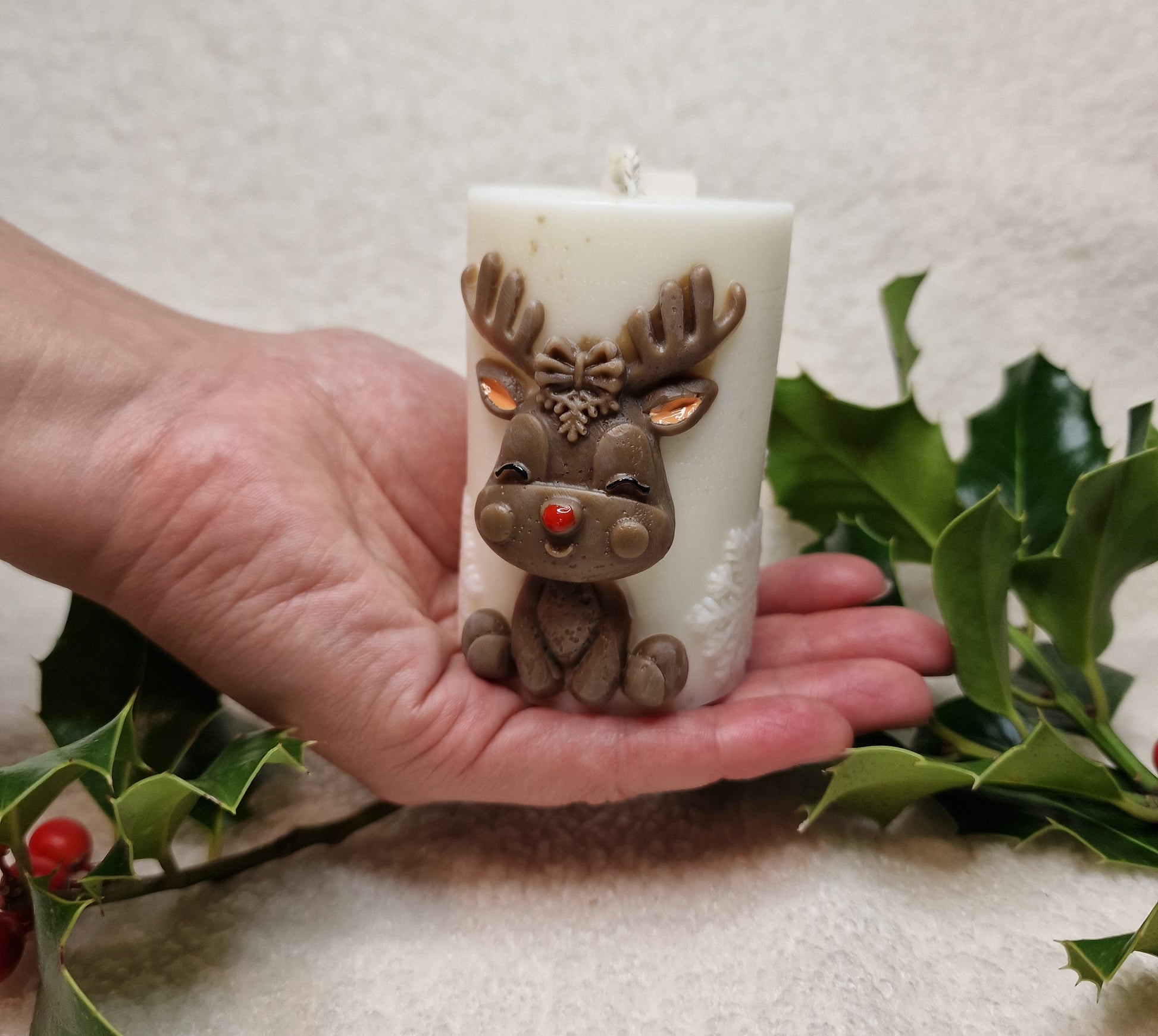 Die Rentier Zylinderkerze ist eine kunstvoll dekorative Kerze mit einem liebevollen Rentier-Motiv, gefertigt aus Soja- und Bienenwachs. Mit ihrem detailreichen Design bringt sie weihnachtliche Stimmung in jeden Raum – ideal für Tischdekoration, Regale oder als festliches Geschenk.