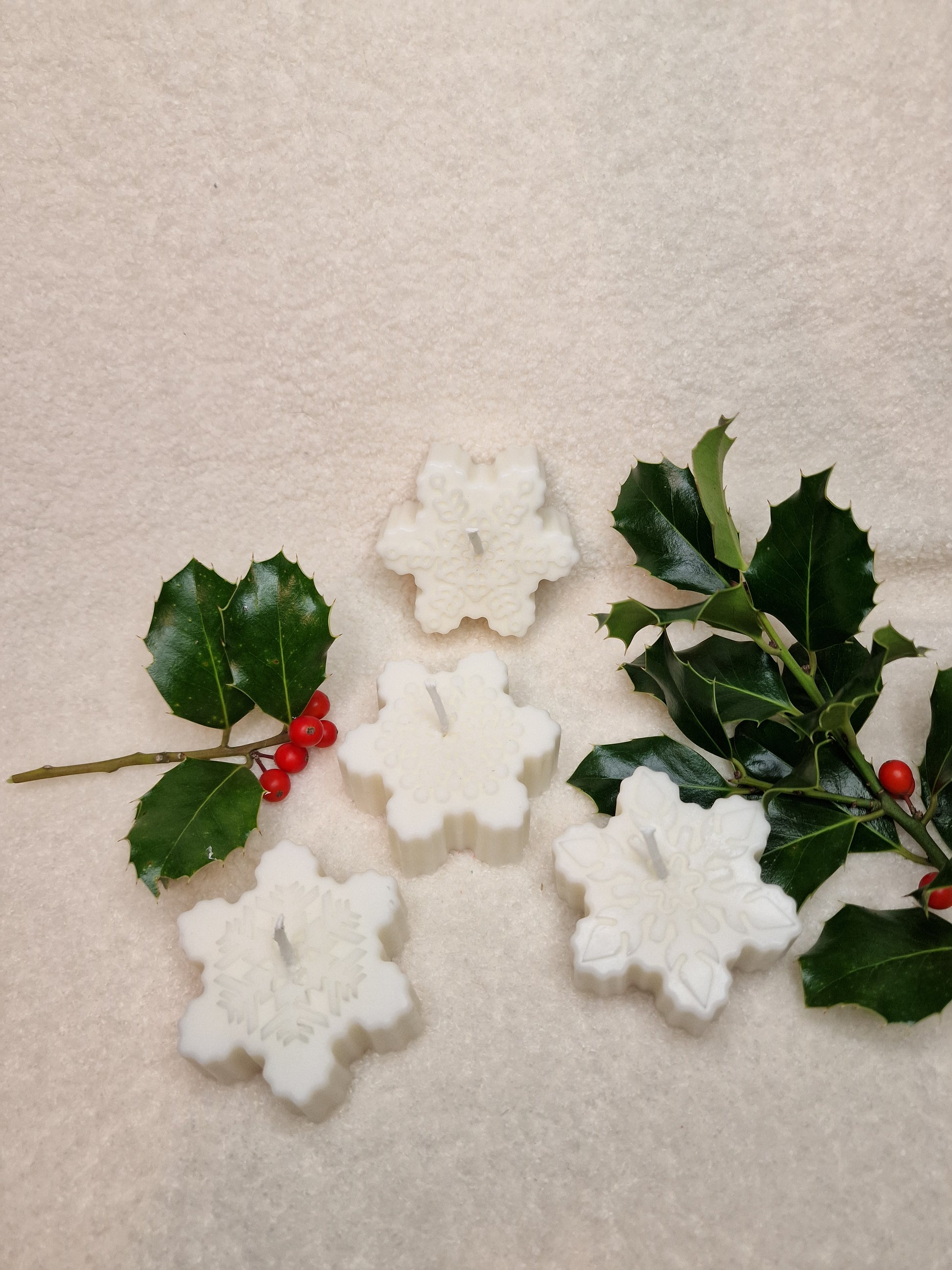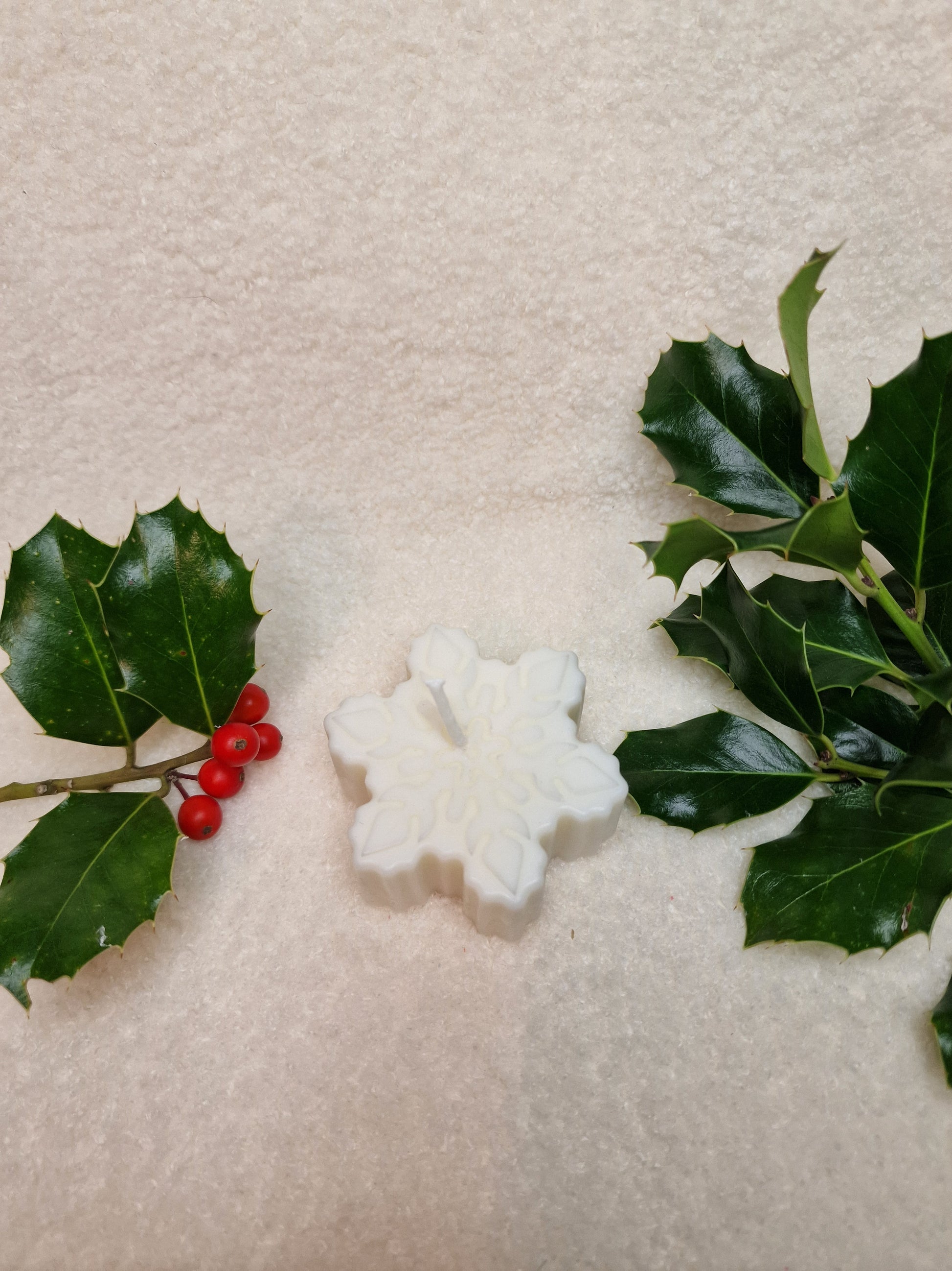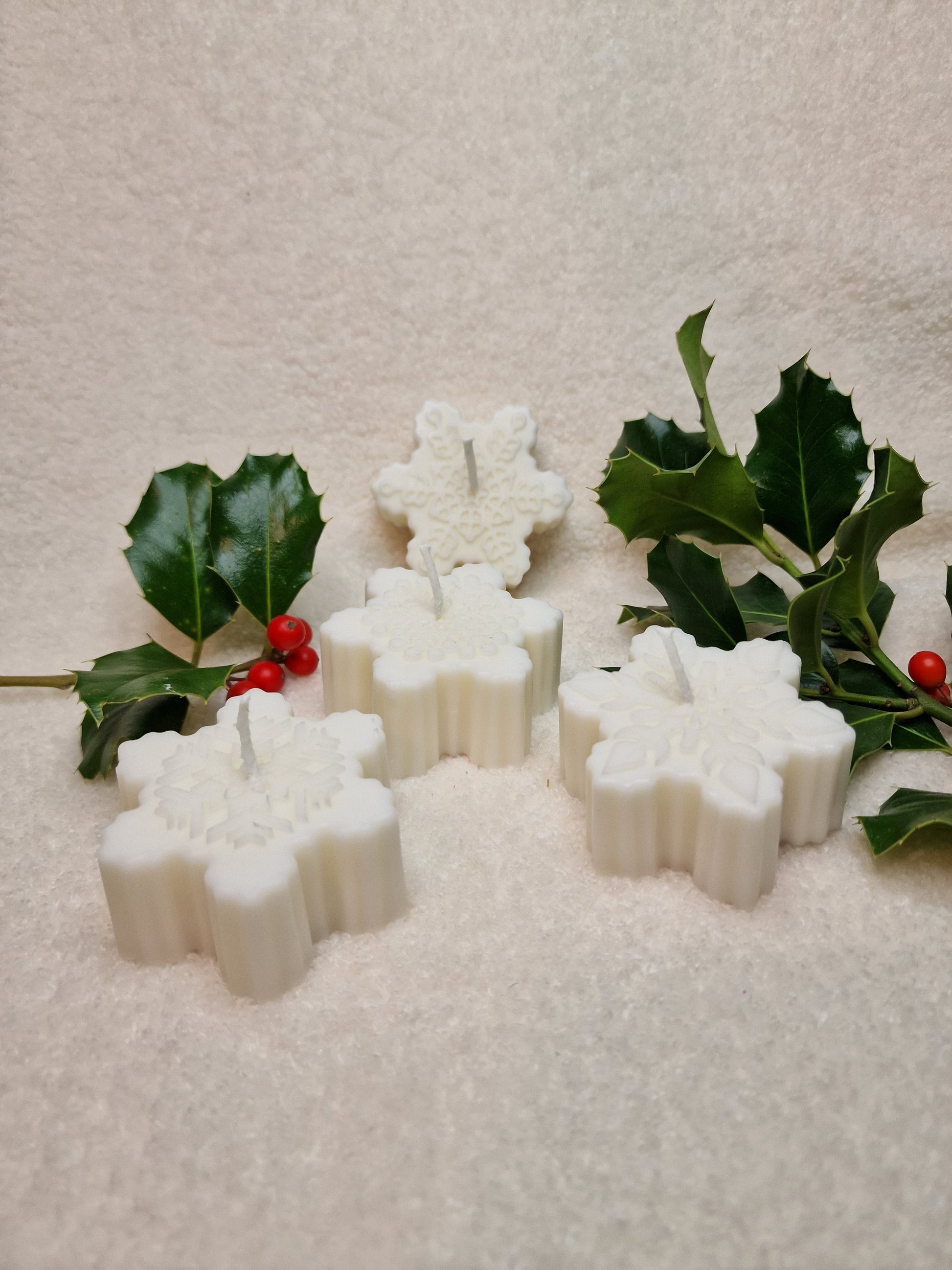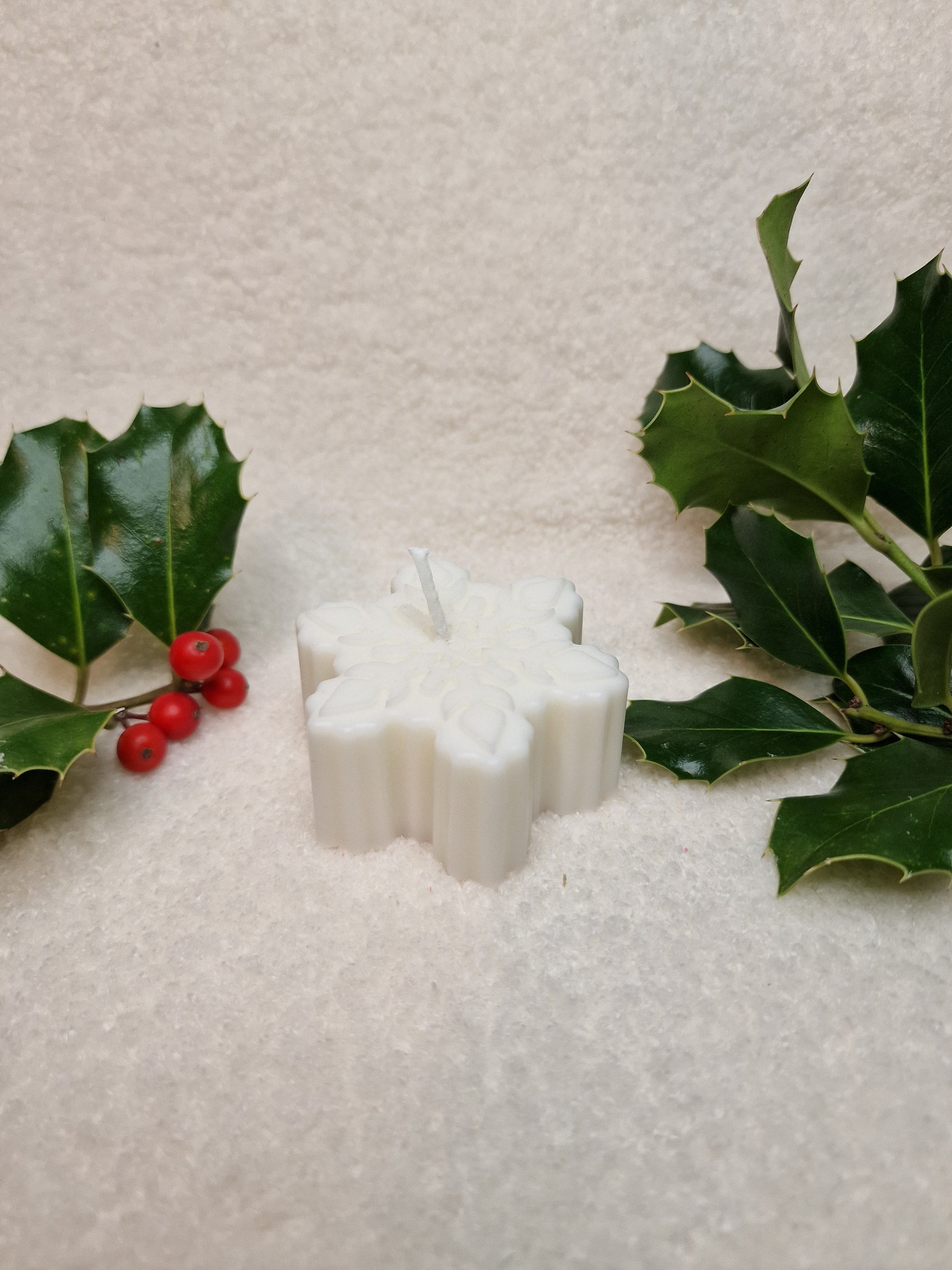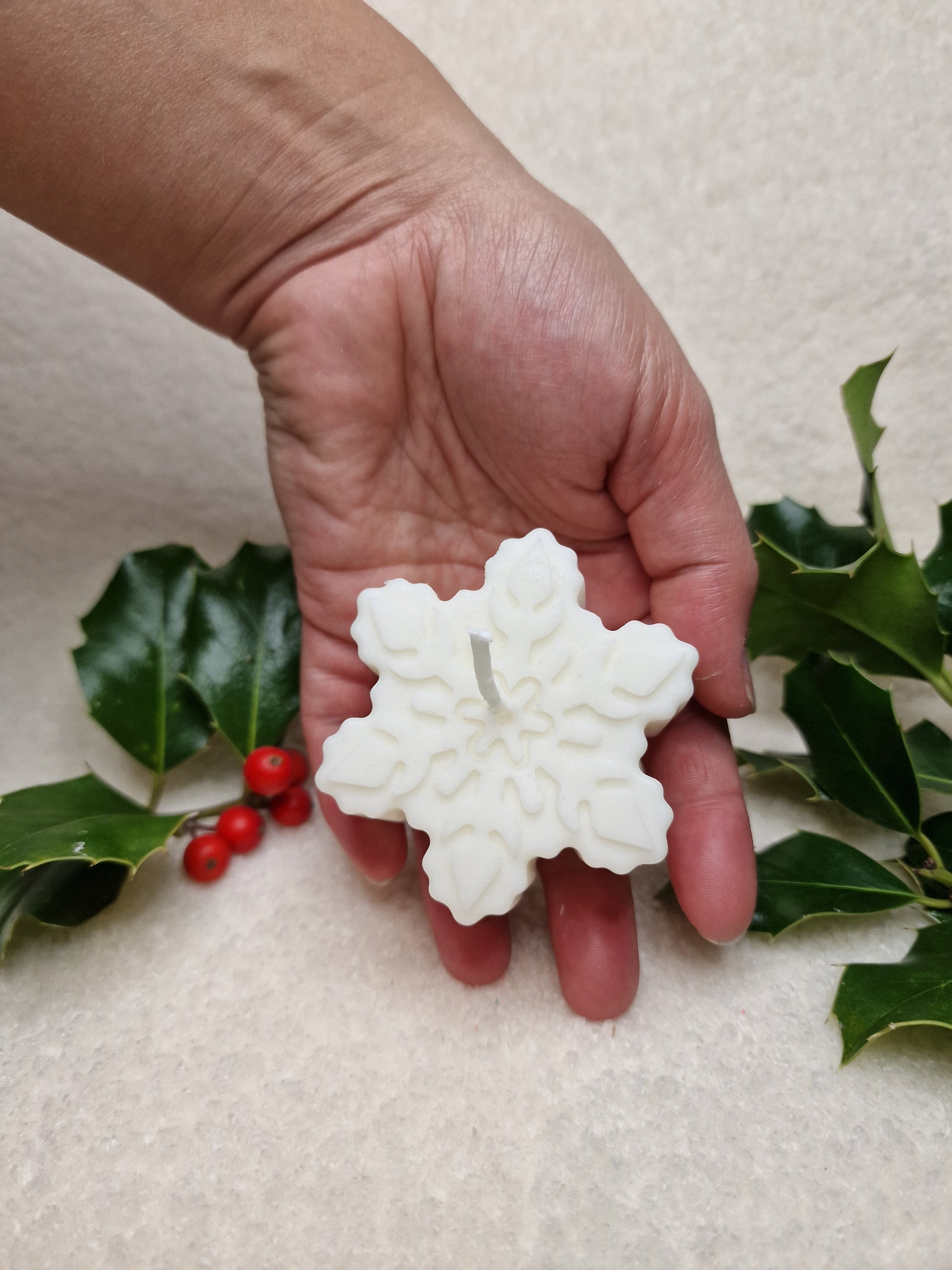 Unsere Schneeflocke-Kerze wird in liebevoller Handarbeit aus einer Mischung aus Sojawachs und Bienenwachs gegossen.