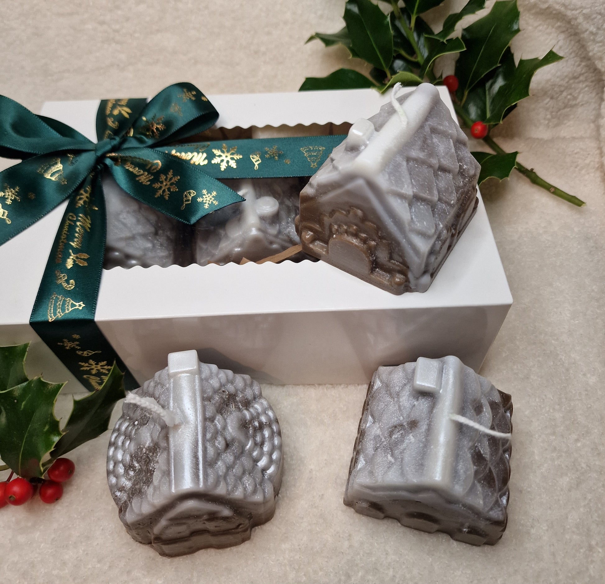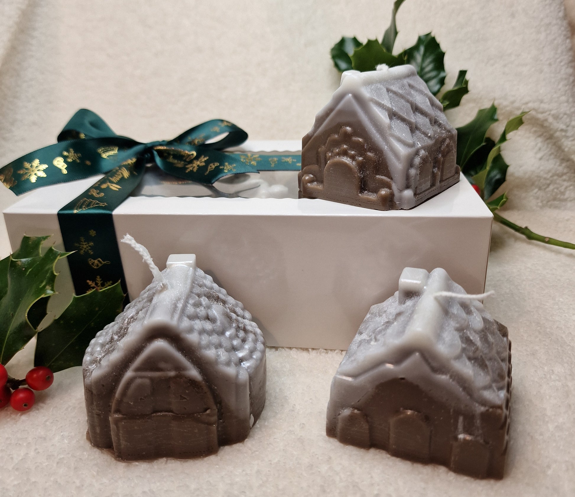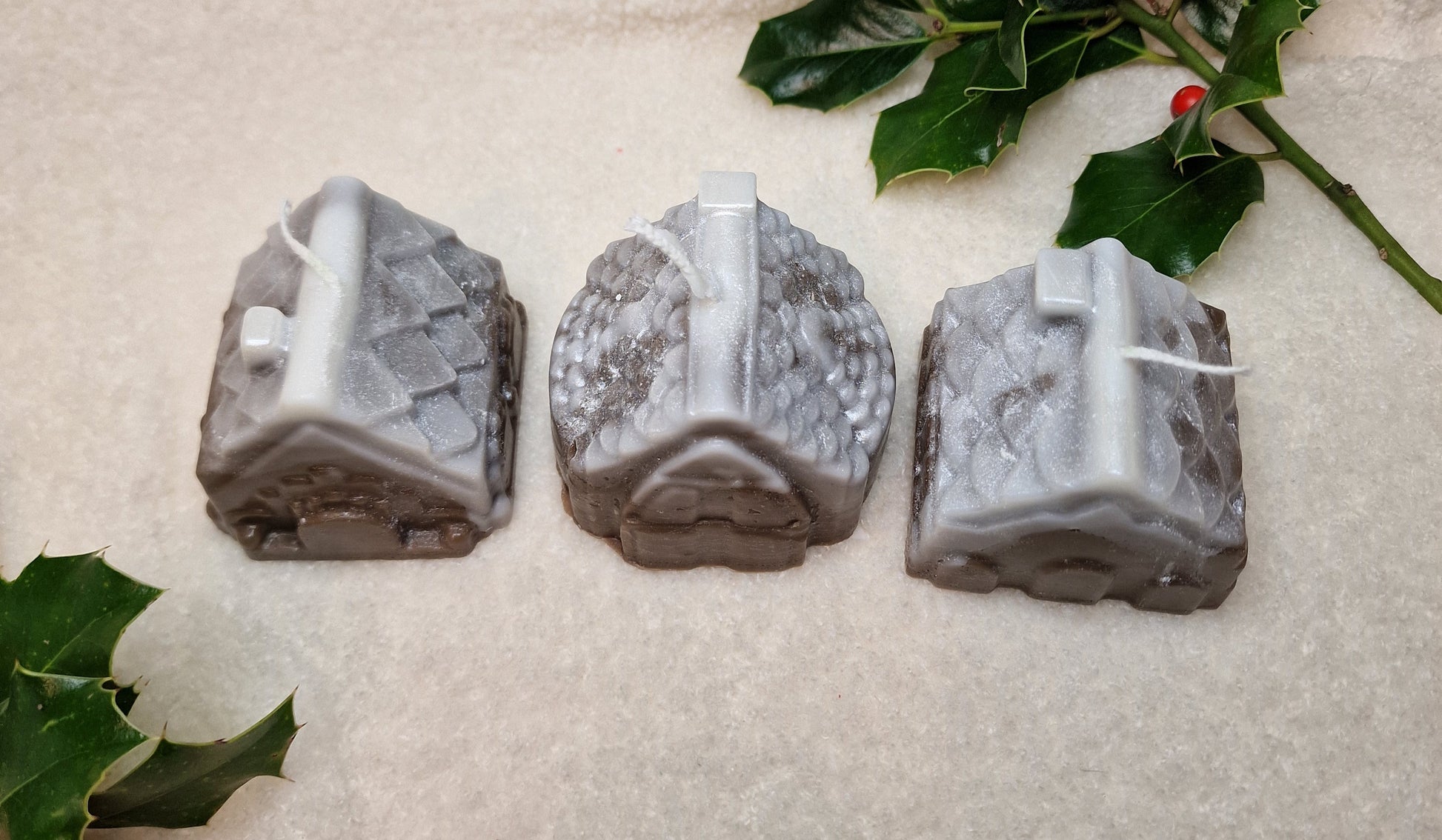 Das Holzhaus Trio besteht aus drei kunstvoll gestalteten, dekorativen Kerzen in Form von kleinen Holzhäusern mit Schnee, gefertigt aus Soja- und Bienenwachs. Mit ihren detaillierten Formen und liebevollen Akzenten bringen sie eine festliche Winterstimmung in jeden Raum – ideal für Tischdekoration, Fensterbänke oder als Geschenk.