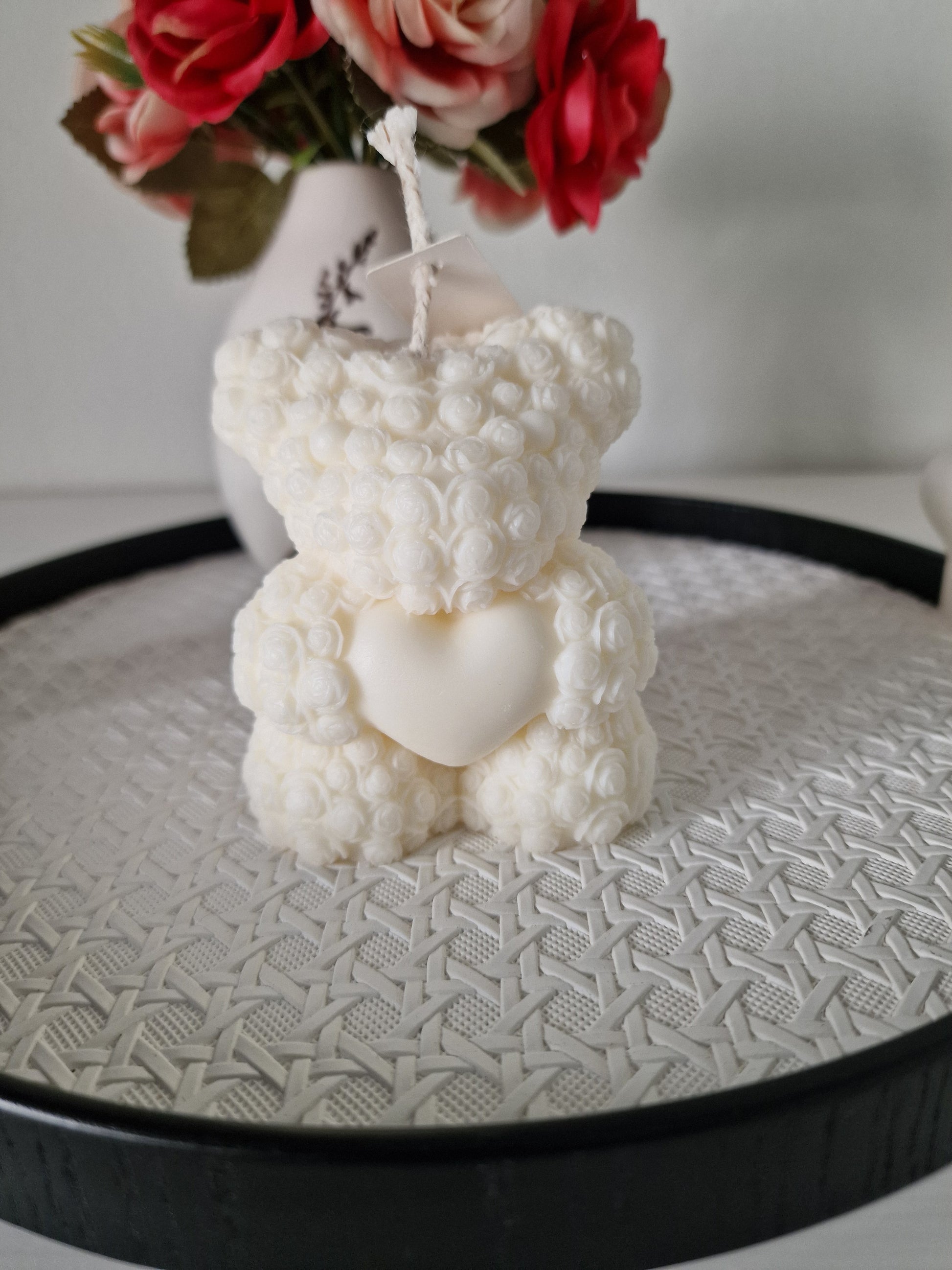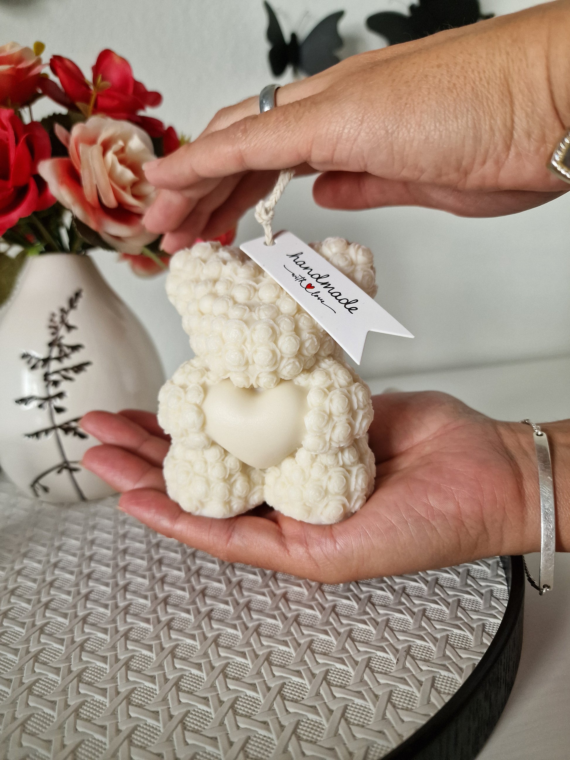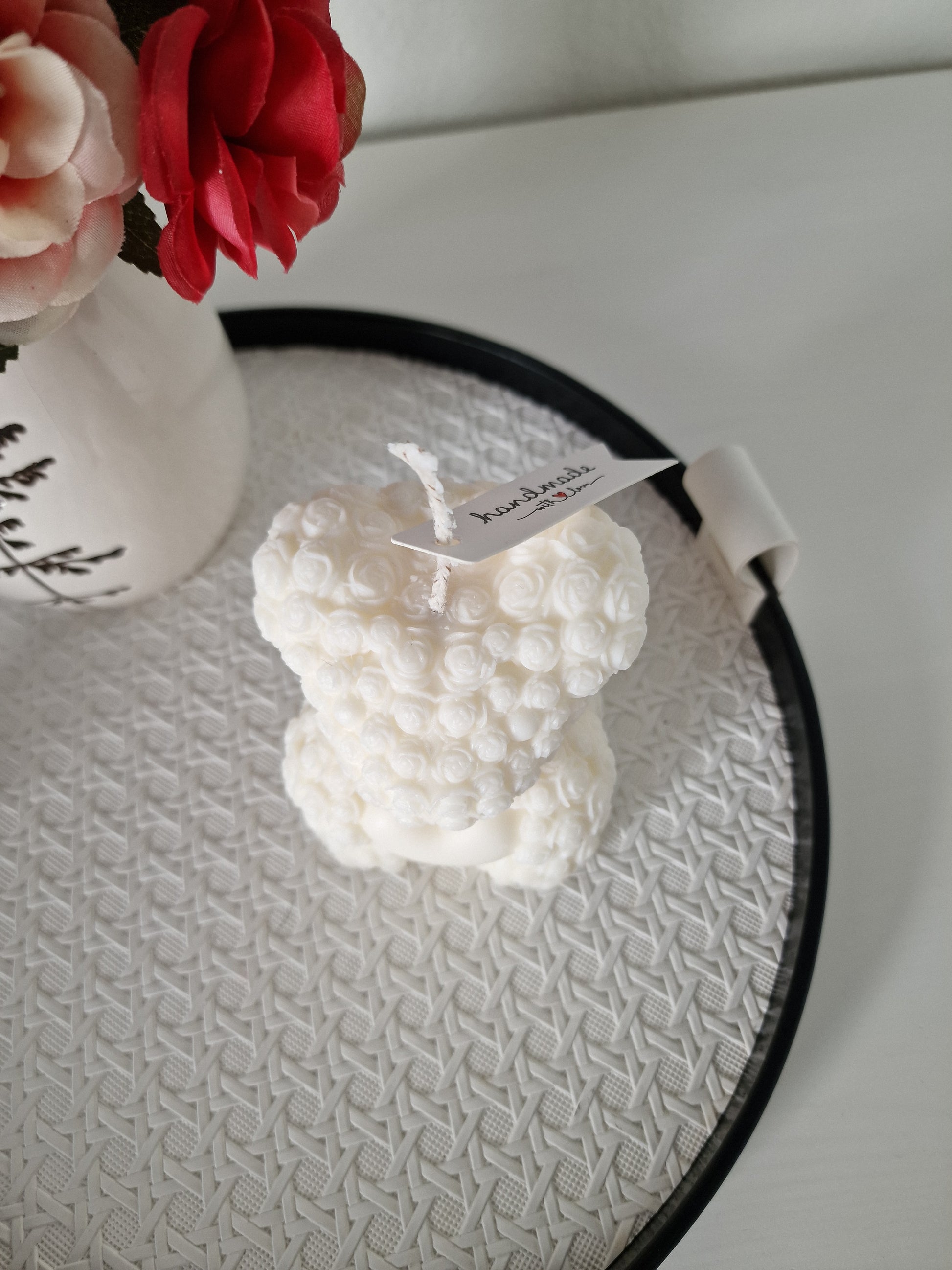 Verleihen Sie Ihrem Zuhause eine warme, stilvolle Atmosphäre mit unserer kunstvoll handgefertigten Kerze in Bärenform – liebevoll verziert mit feinen Rosen.