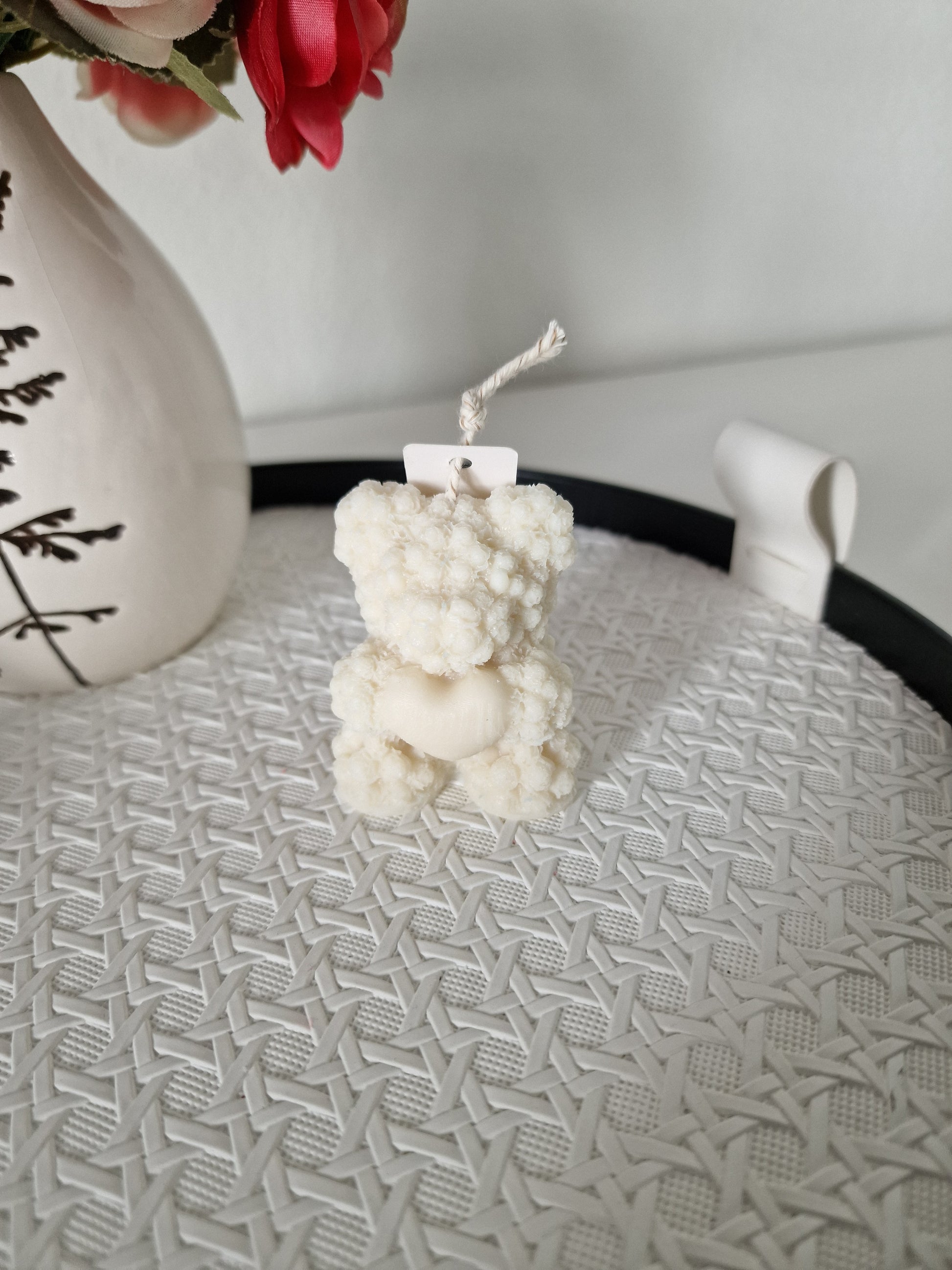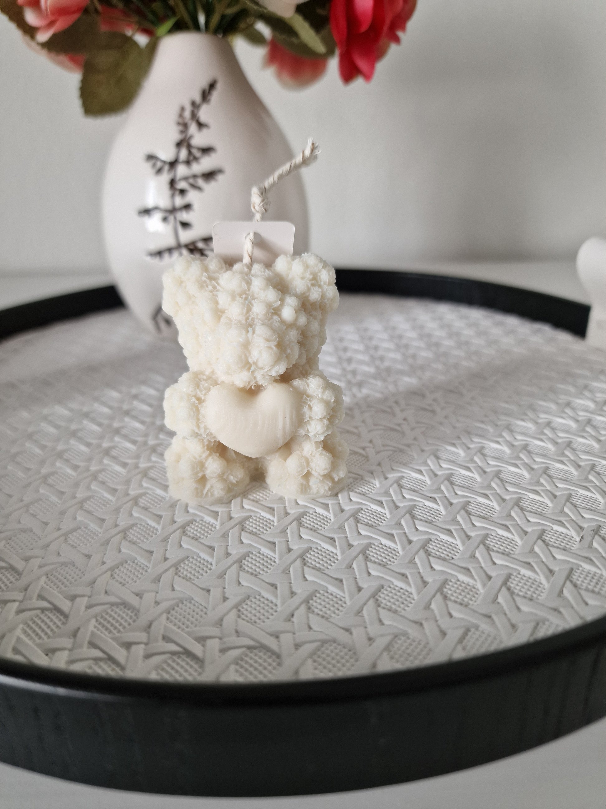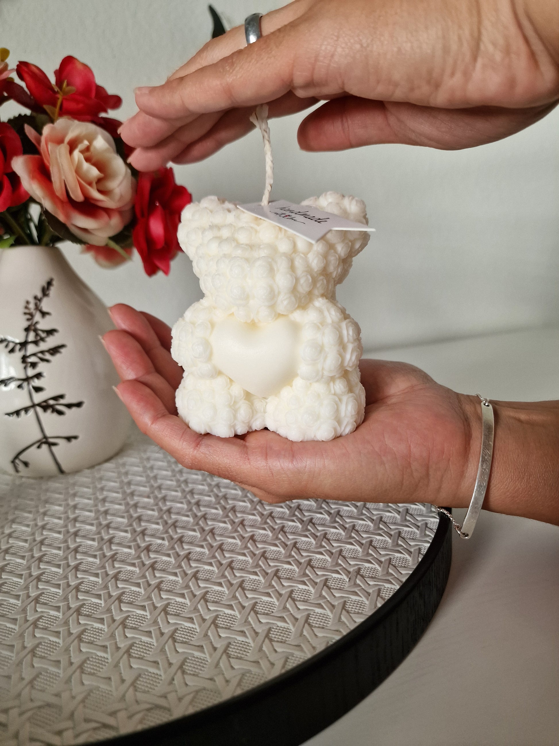 Verleihen Sie Ihrem Zuhause eine warme, stilvolle Atmosphäre mit unserer kunstvoll handgefertigten Kerze in Bärenform – liebevoll verziert mit feinen Rosen.