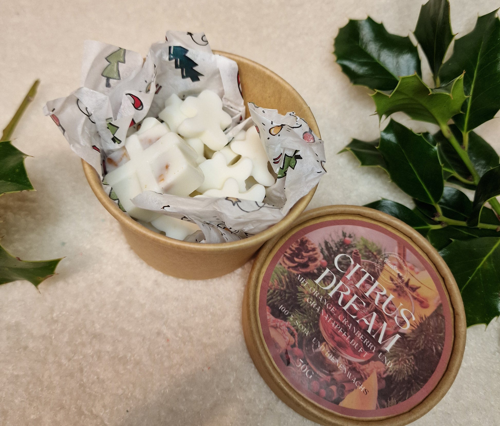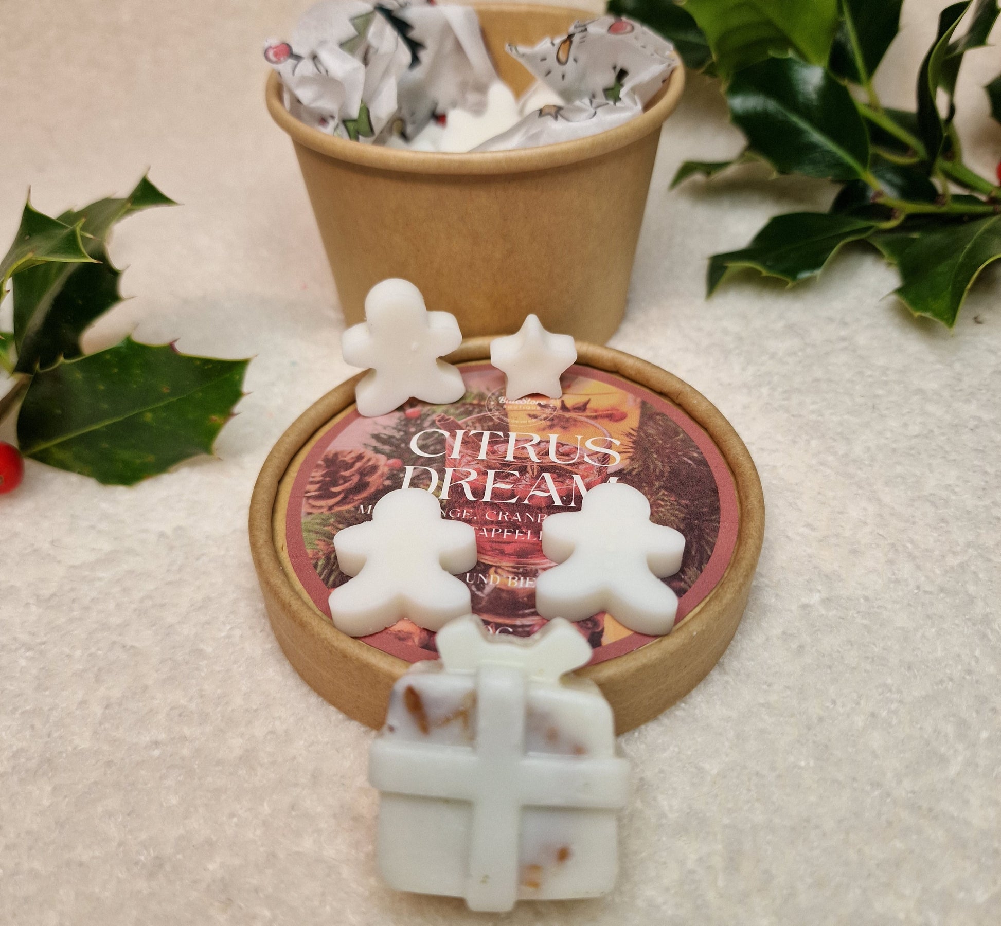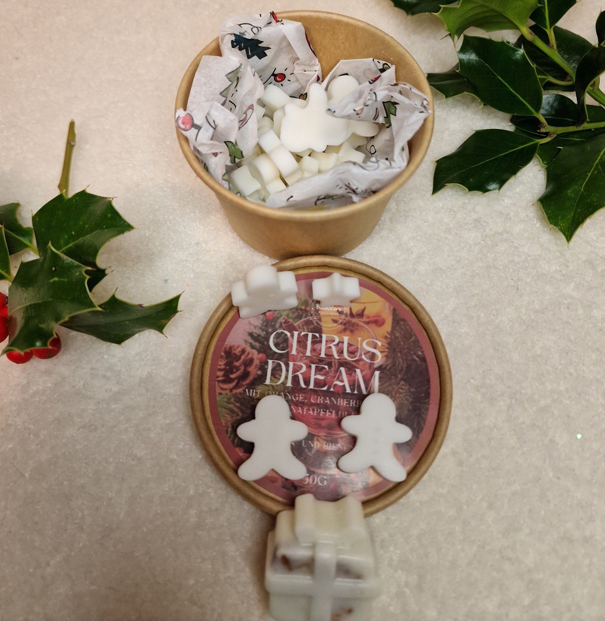Bringen Sie frische und festliche Aromen in Ihr Zuhause mit unserem Citrus Dream Waxmelt. Handgefertigt aus Sojawachs & Bienenwachs, verströmt dieser Waxmelt einen fruchtig-frischen Duft, der sofort Weihnachtsstimmung und Wohlbefinden schafft.