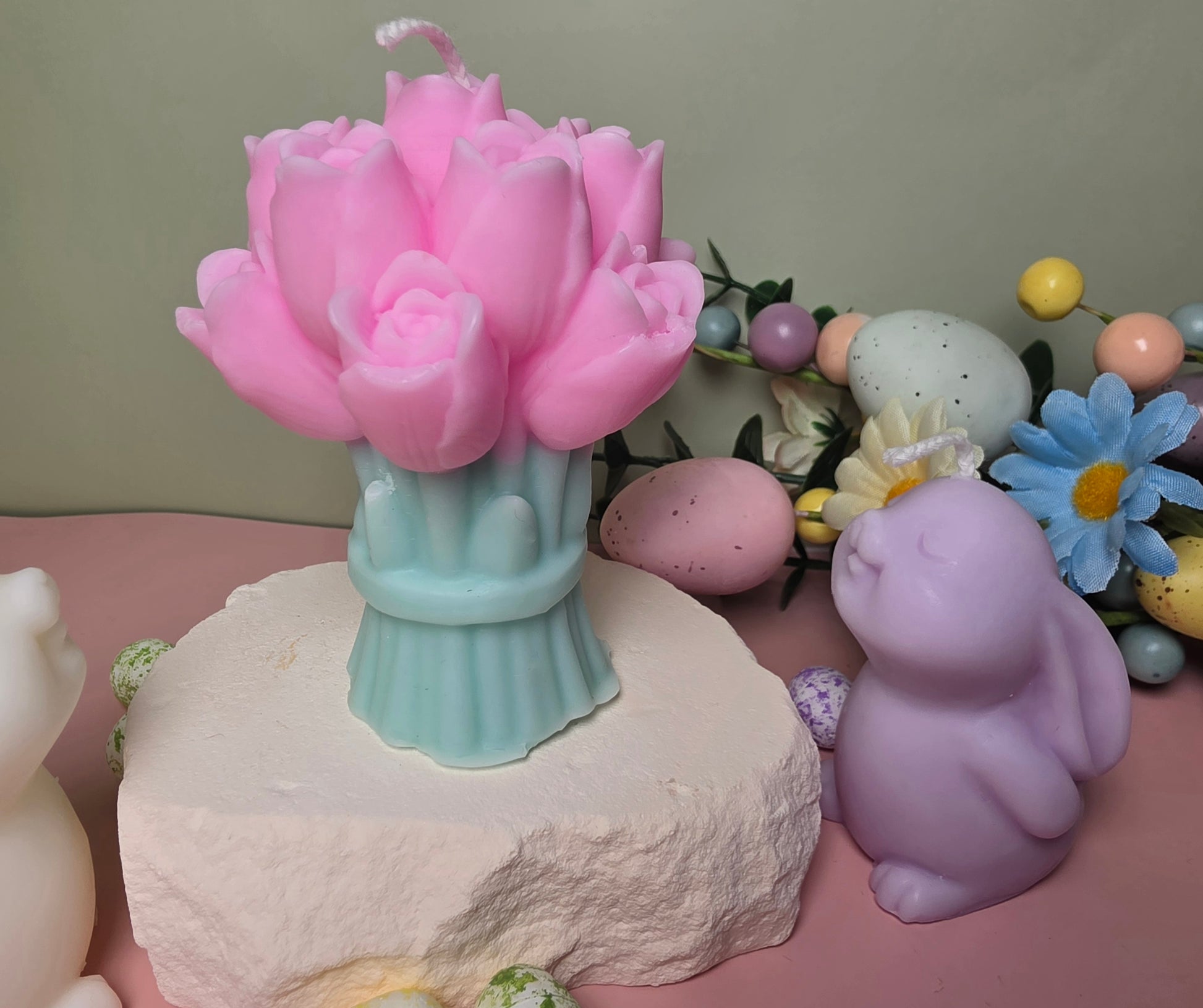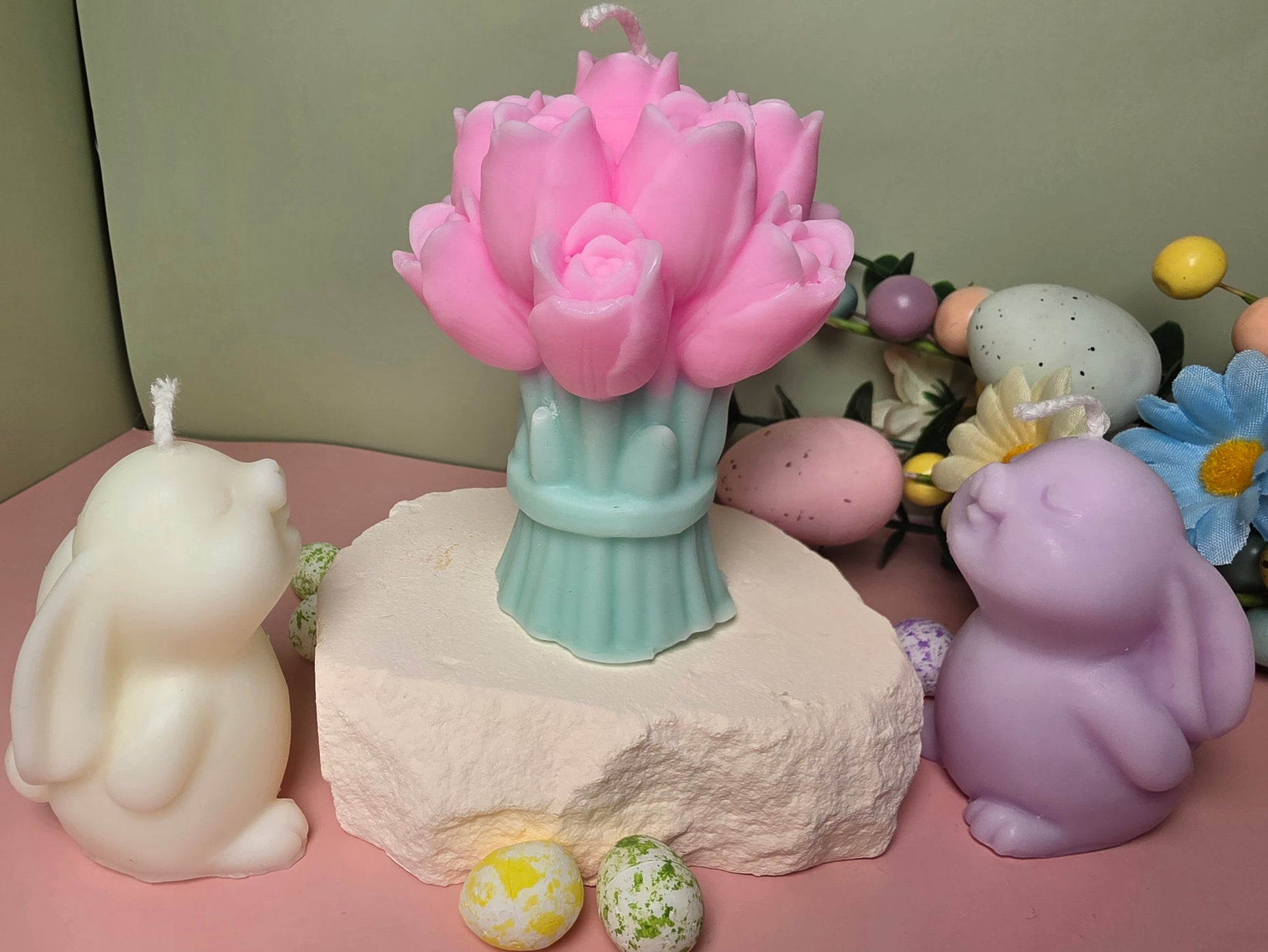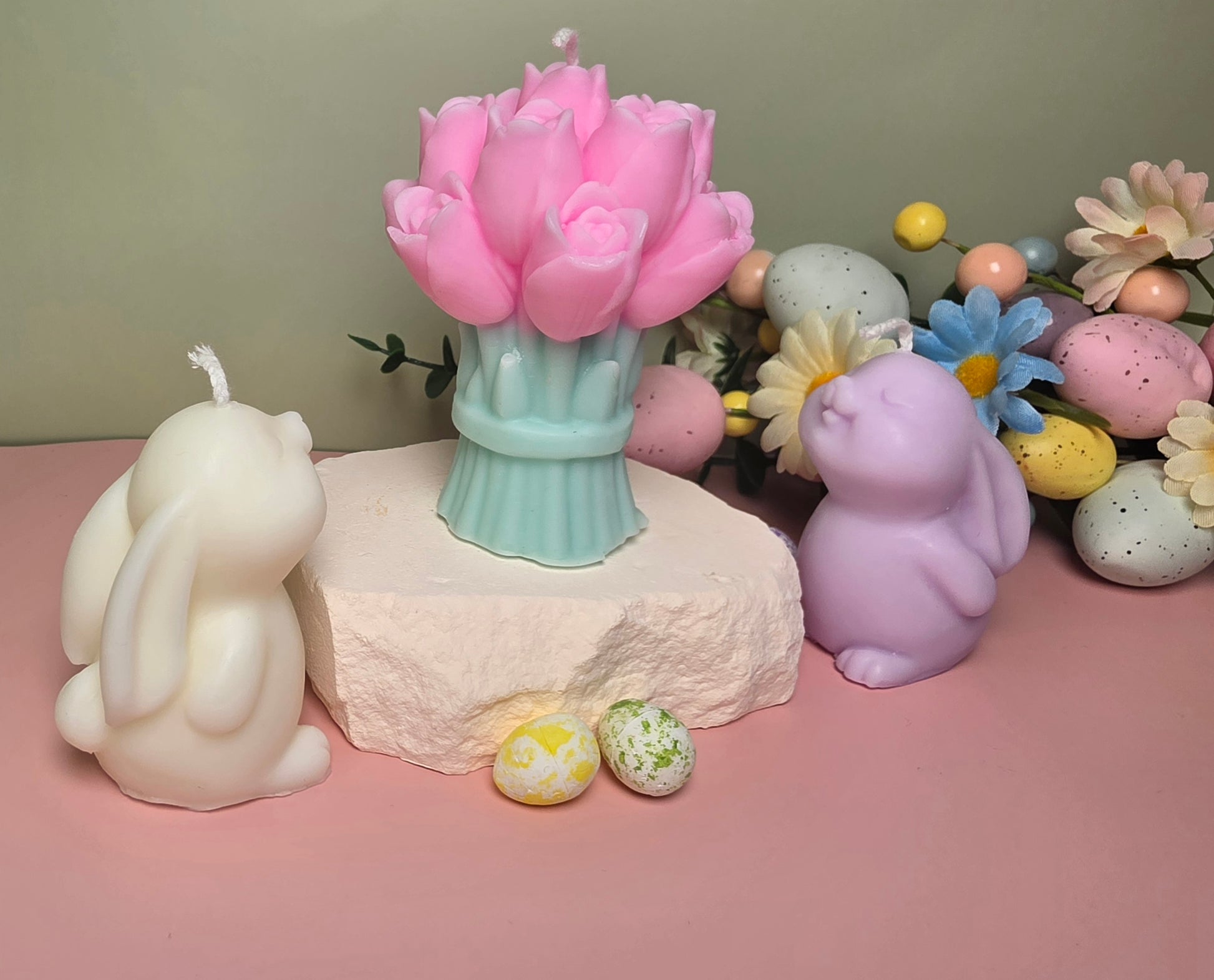 Die beiden Hasen wirken, als würden sie den Blumenstrauß bewundern, wodurch eine verspielte, elegante und harmonische Osterdekoration entsteht. Jedes Stück ist handgefertigt und aus natürlicher Wachsmischung, was einzigartige Details und hochwertige Verarbeitung garantiert.