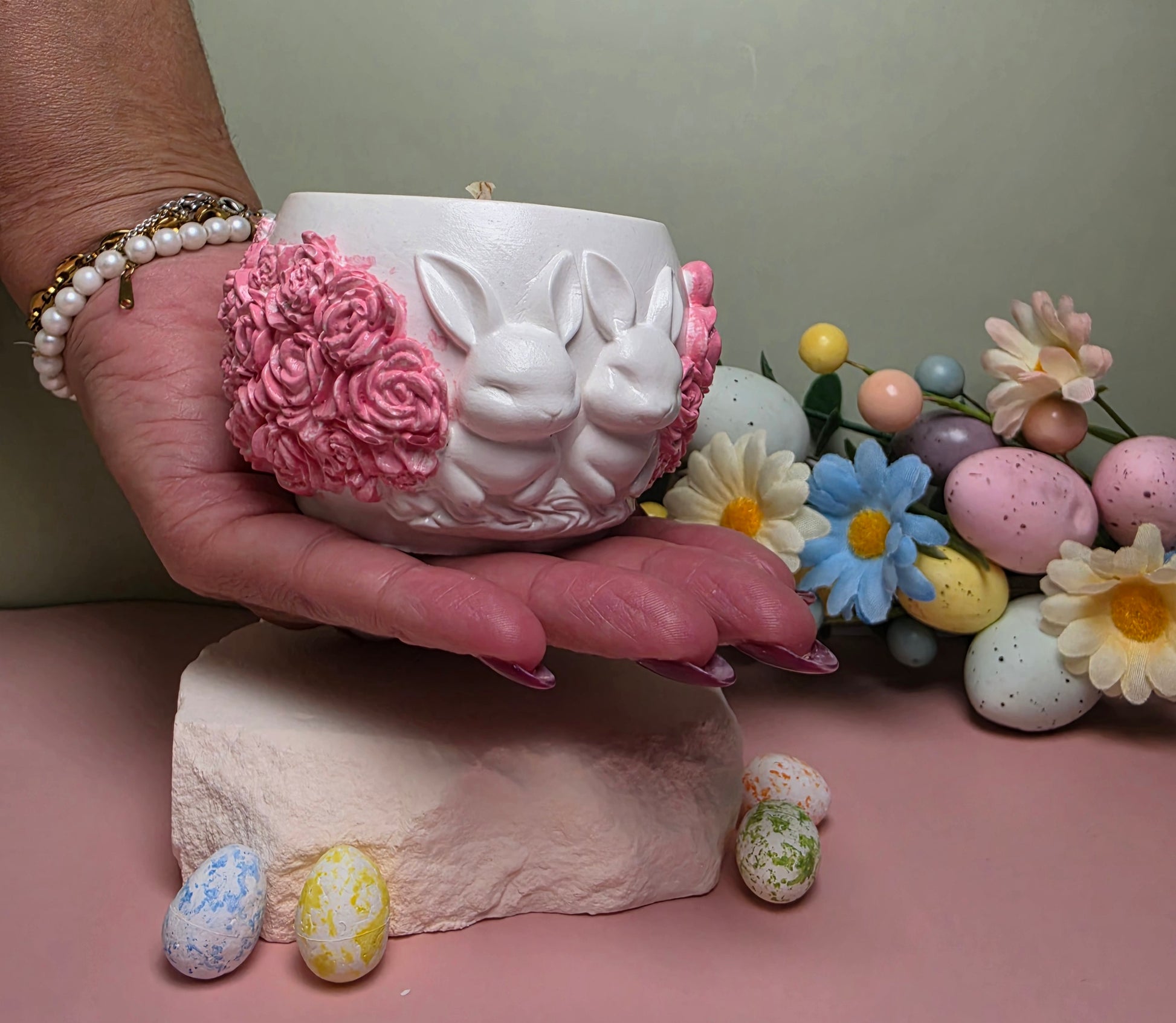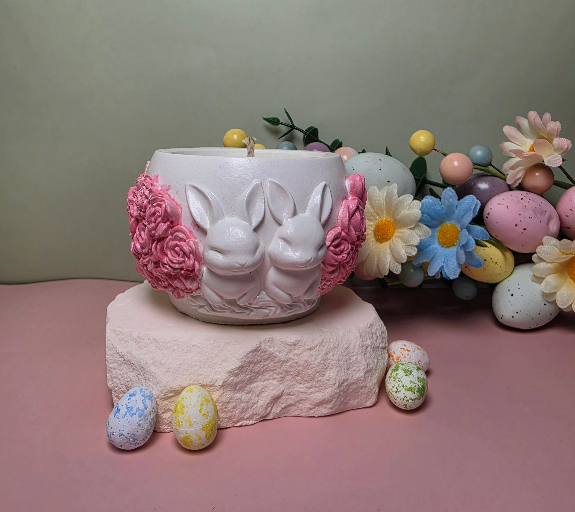 - Handgefertigtes Gipsgefäß mit Hasen- und Rosendekoration