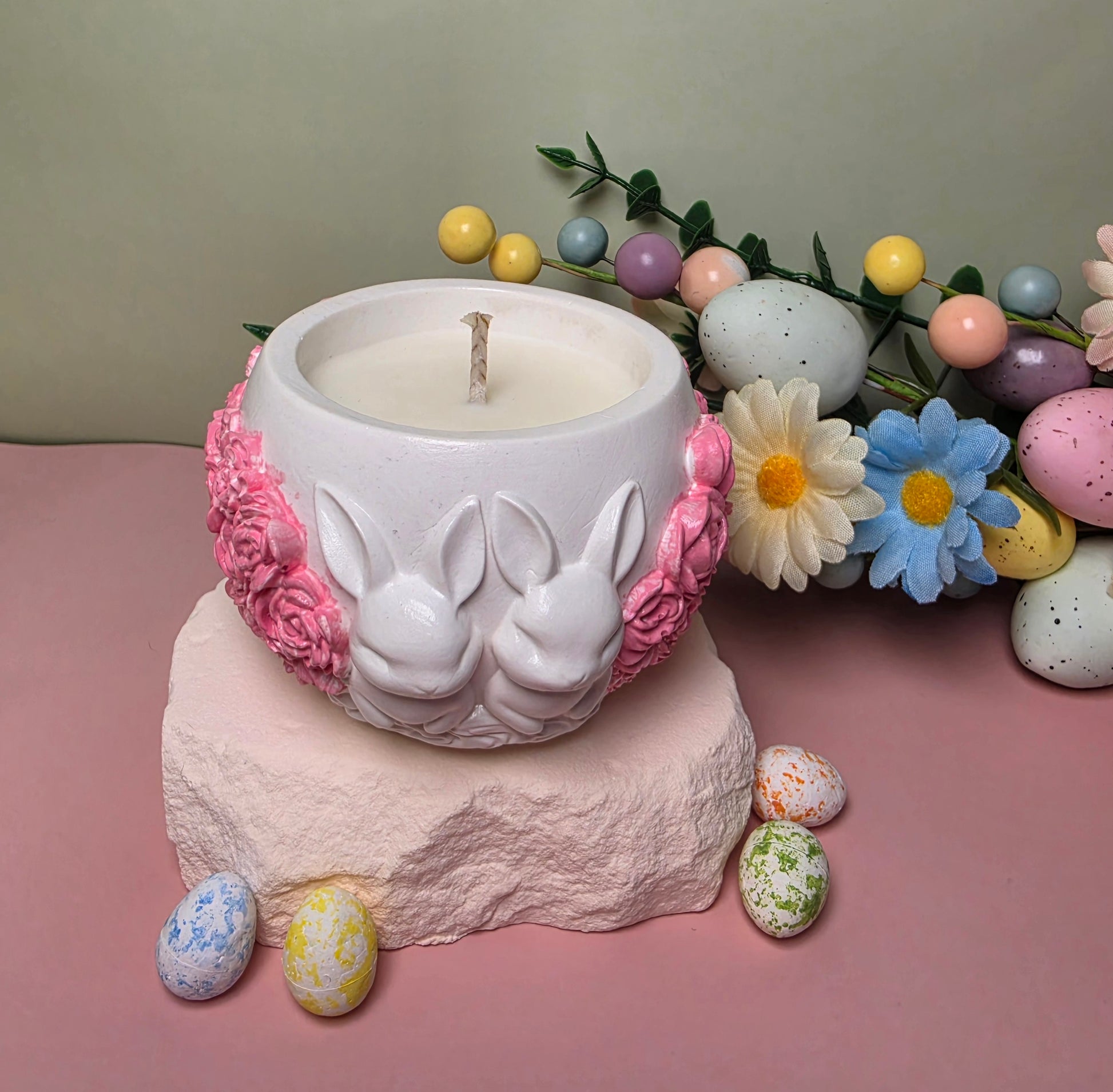 Die Kerze wird aus natürlichem Sojawachs handgegossen und befindet sich in einem handgefertigten Gipsgefäß, das mit einer liebevollen Hasen- und Rosendekoration gestaltet ist. Dadurch wird jede Kerze zu einem besonderen Dekorationsstück – perfekt für Frühling und Ostern.