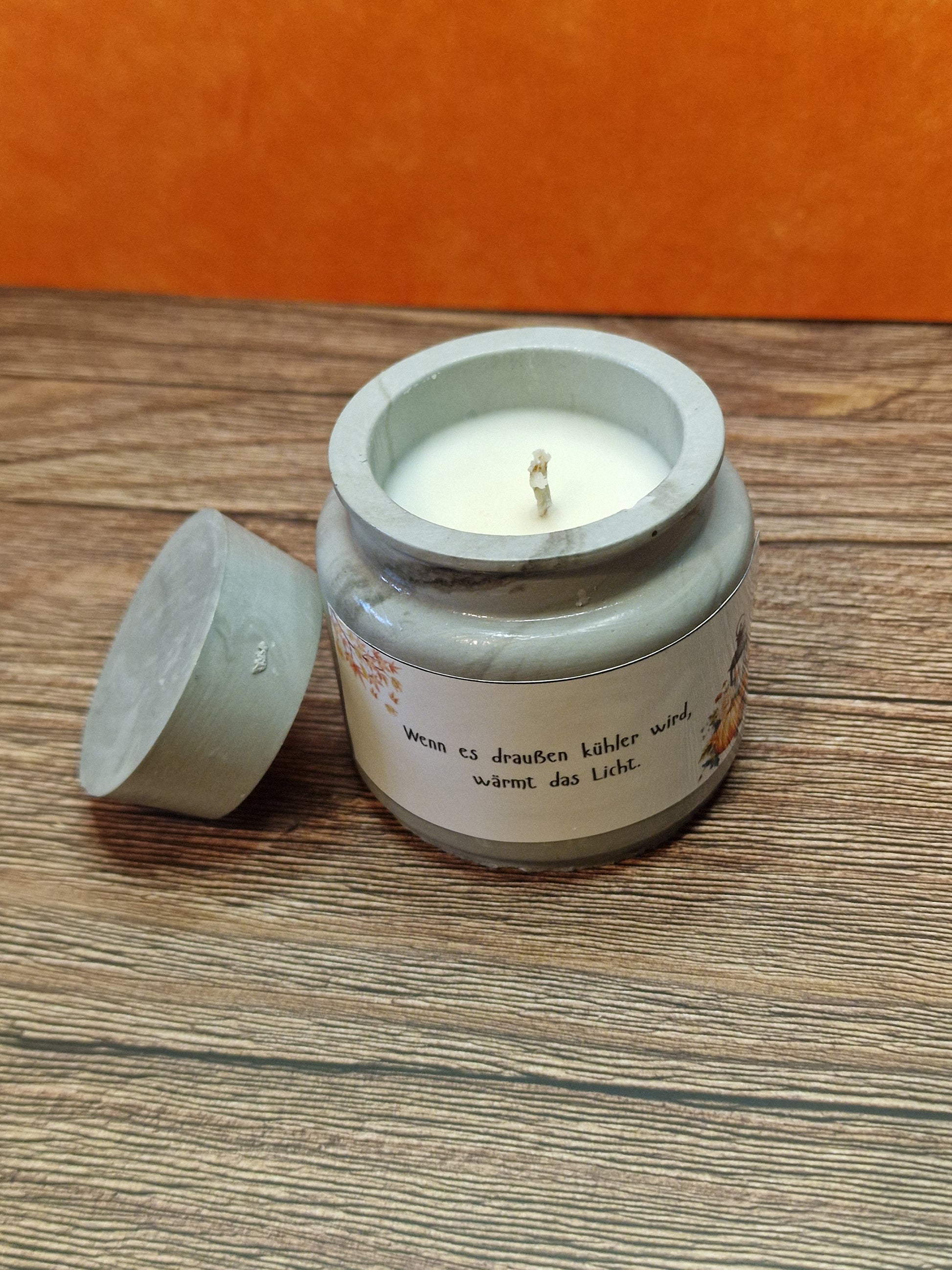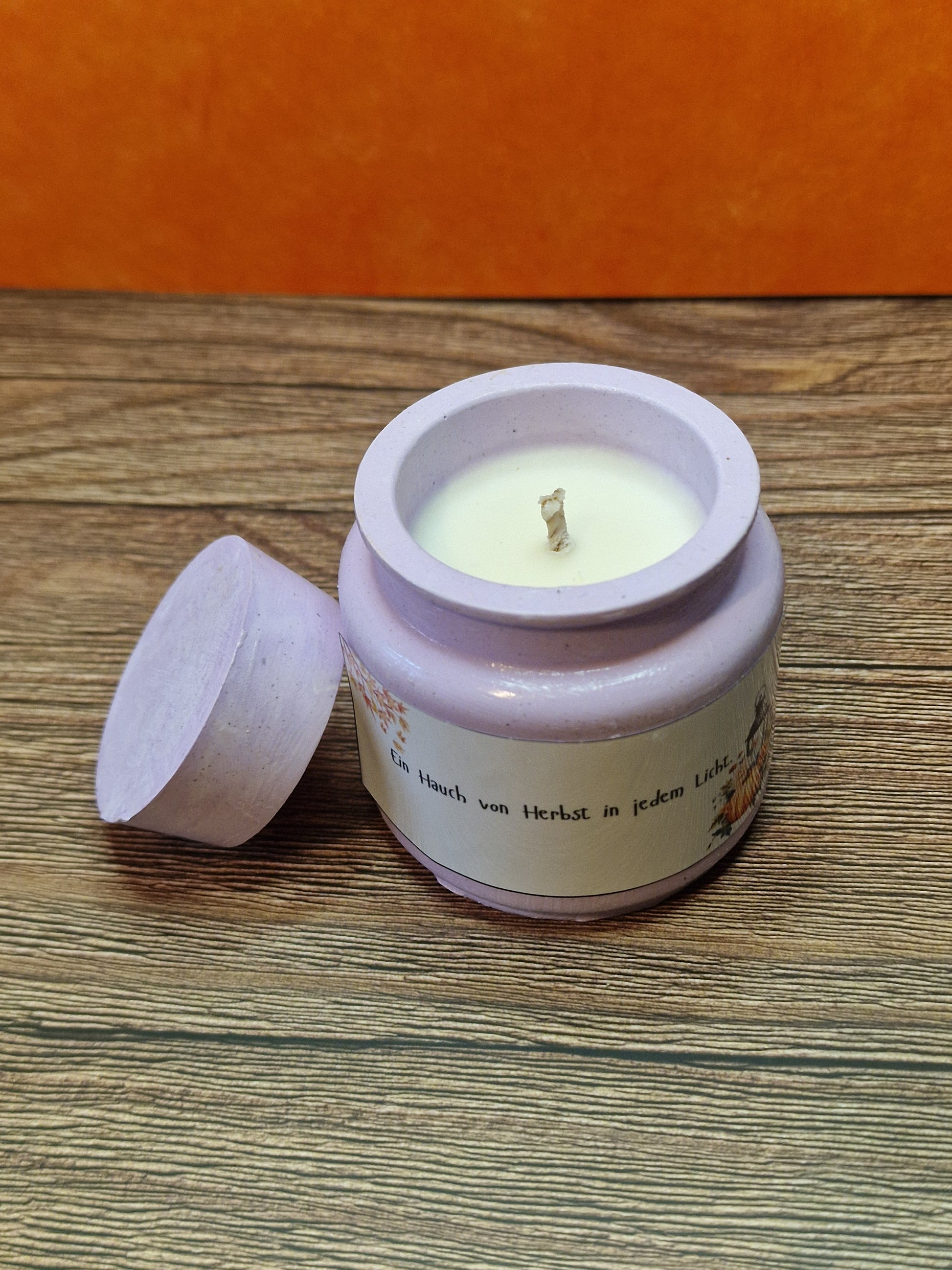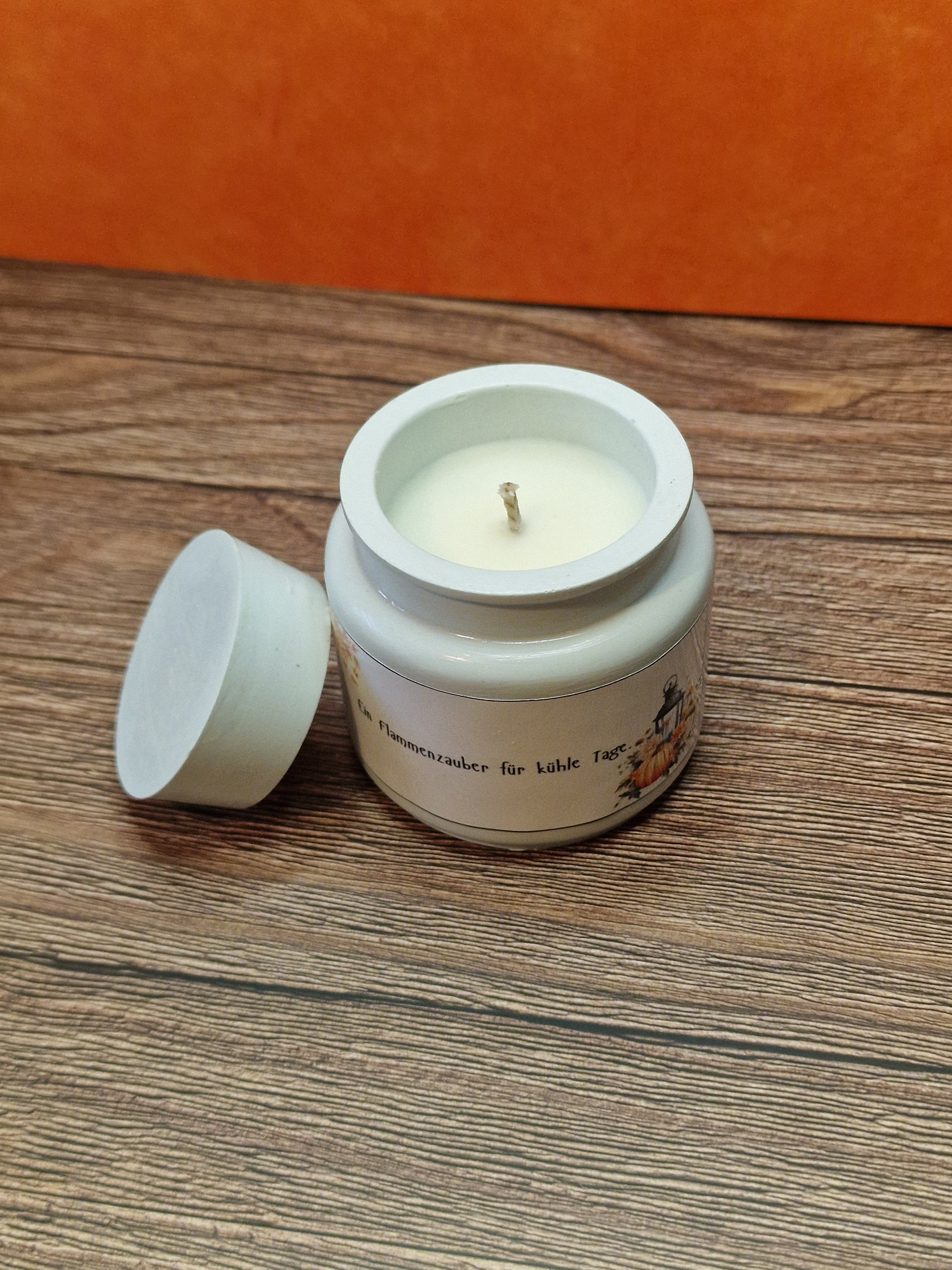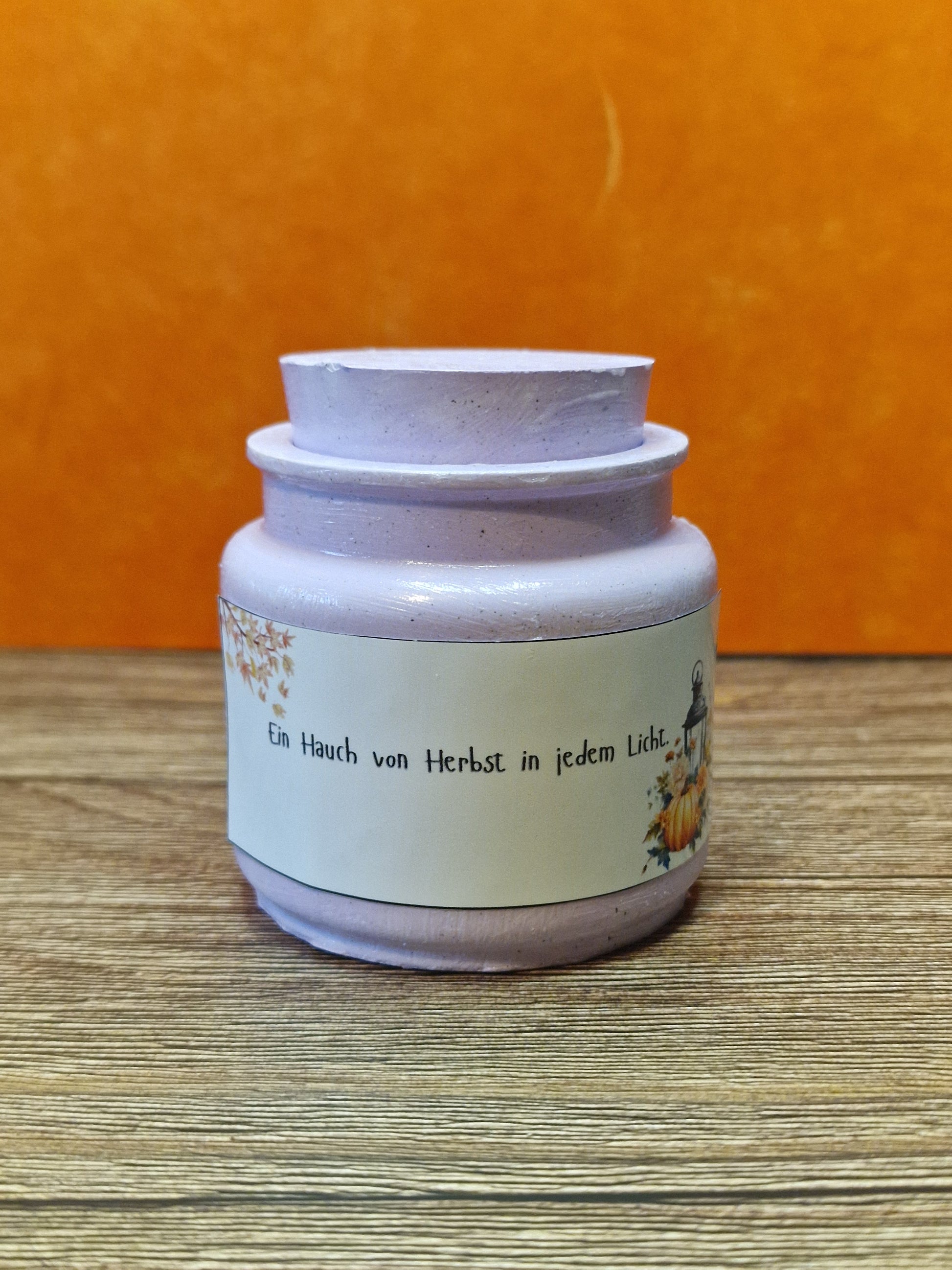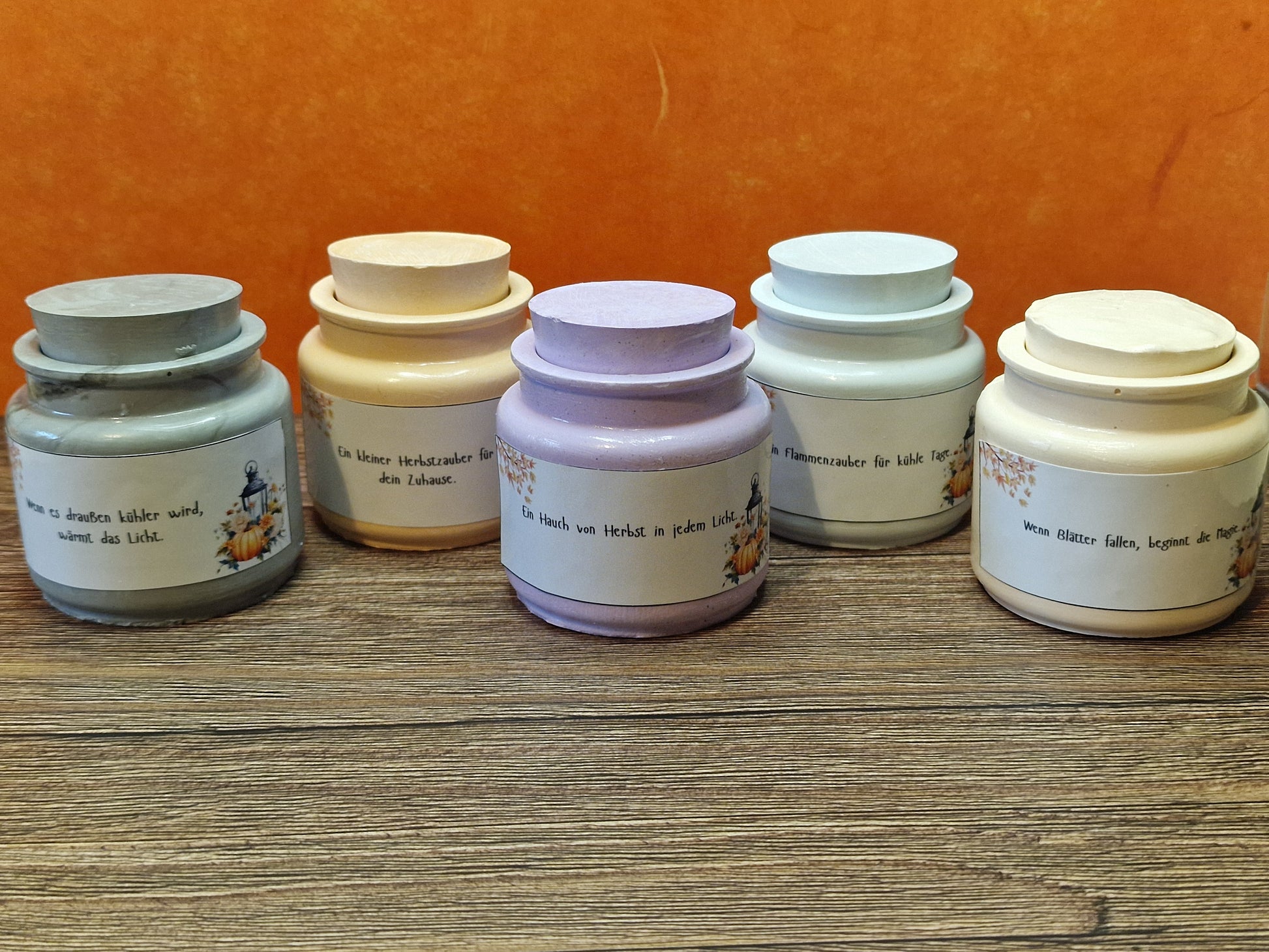 Jede 55 g Sojakerze steckt in einem handgefertigten Gips-Pot in einer eigenen Farbe und trägt eine liebevolle, herbstliche Botschaft. Der Duft von Apfel, Zimt und Jasmin erfüllt Ihr Zuhause mit Gemütlichkeit, Entspannung und Wohlbefinden – perfekt für stimmungsvolle Abende oder als dekoratives Highlight.