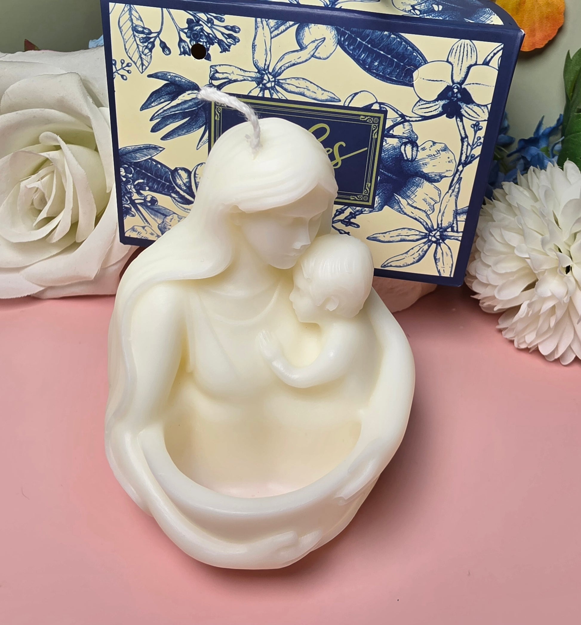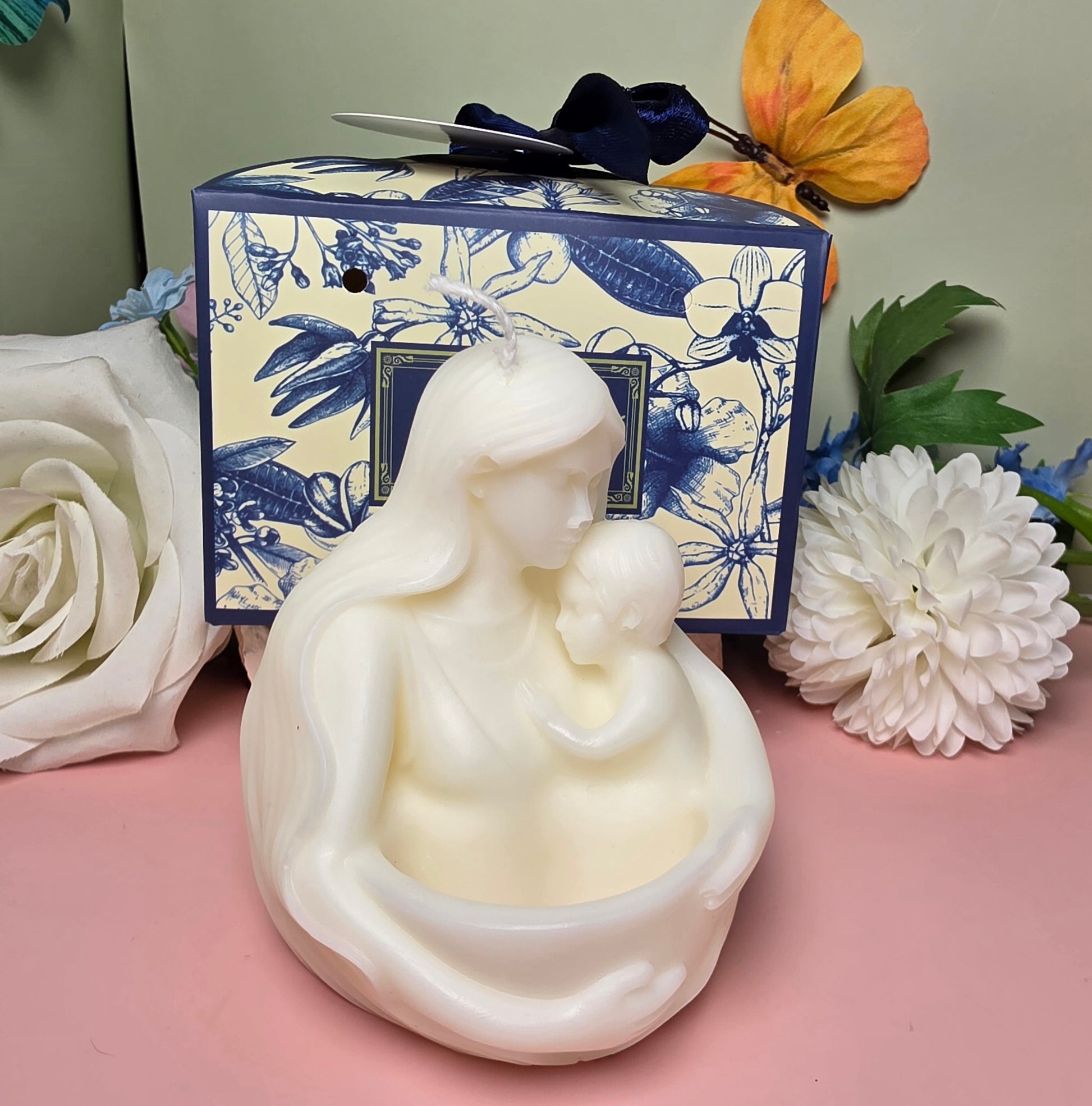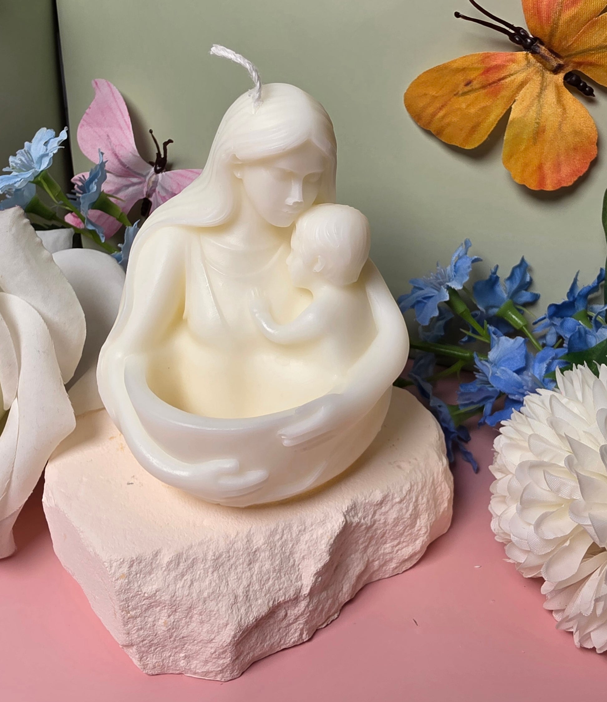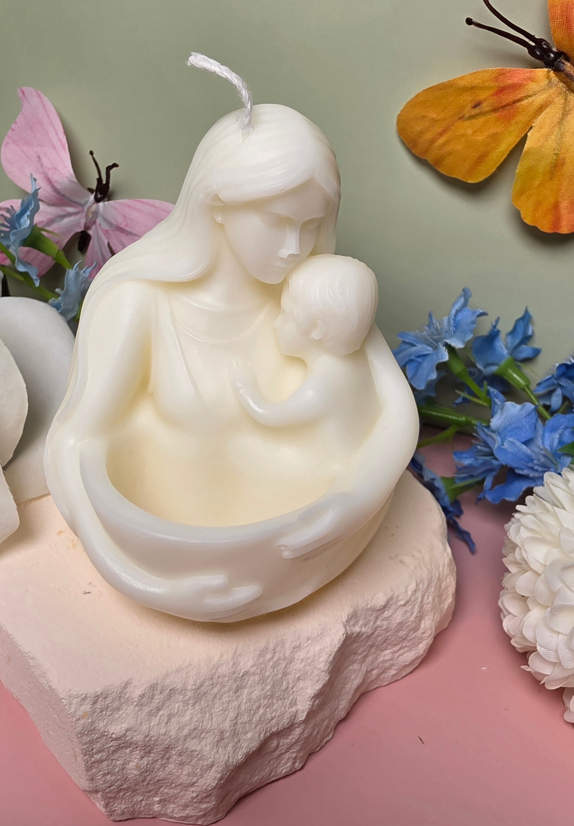 Die Mutterliebe Kerze ist eine liebevoll handgefertigte Dekokerze aus einer hochwertigen Mischung aus Sojawachs und Bienenwachs. Das besondere Design zeigt eine Frau, die ein Kind in den Armen hält, und symbolisiert Liebe, Geborgenheit und die besondere Verbindung zwischen Mutter und Kind.