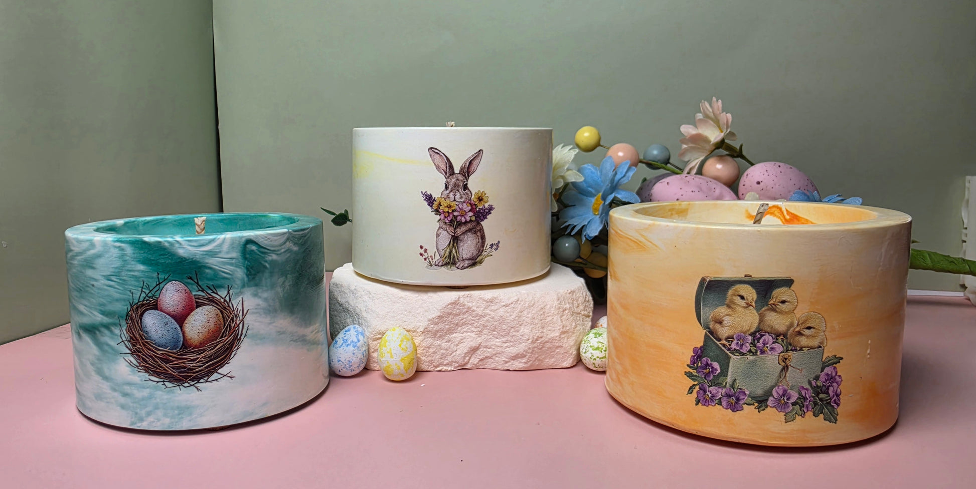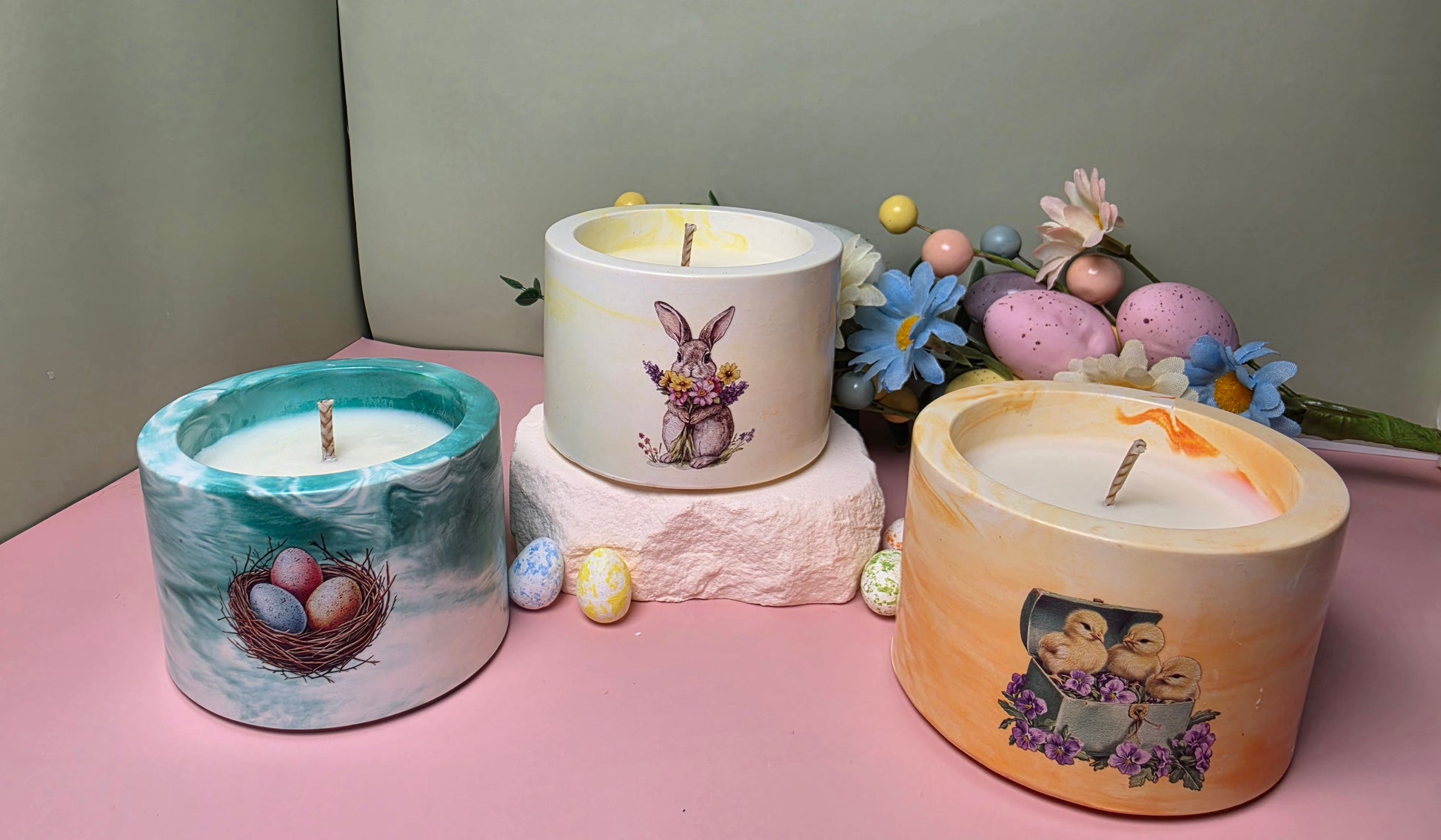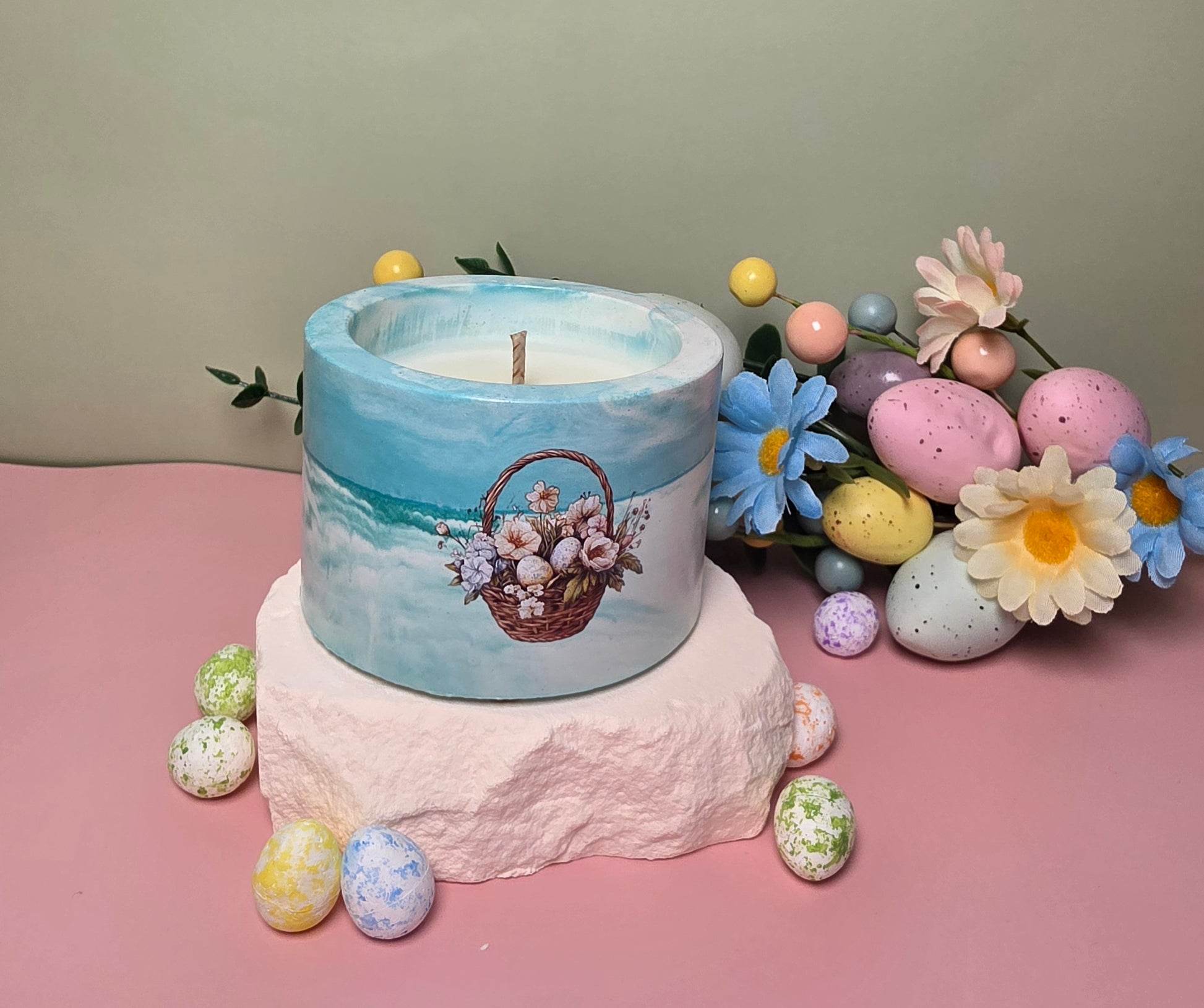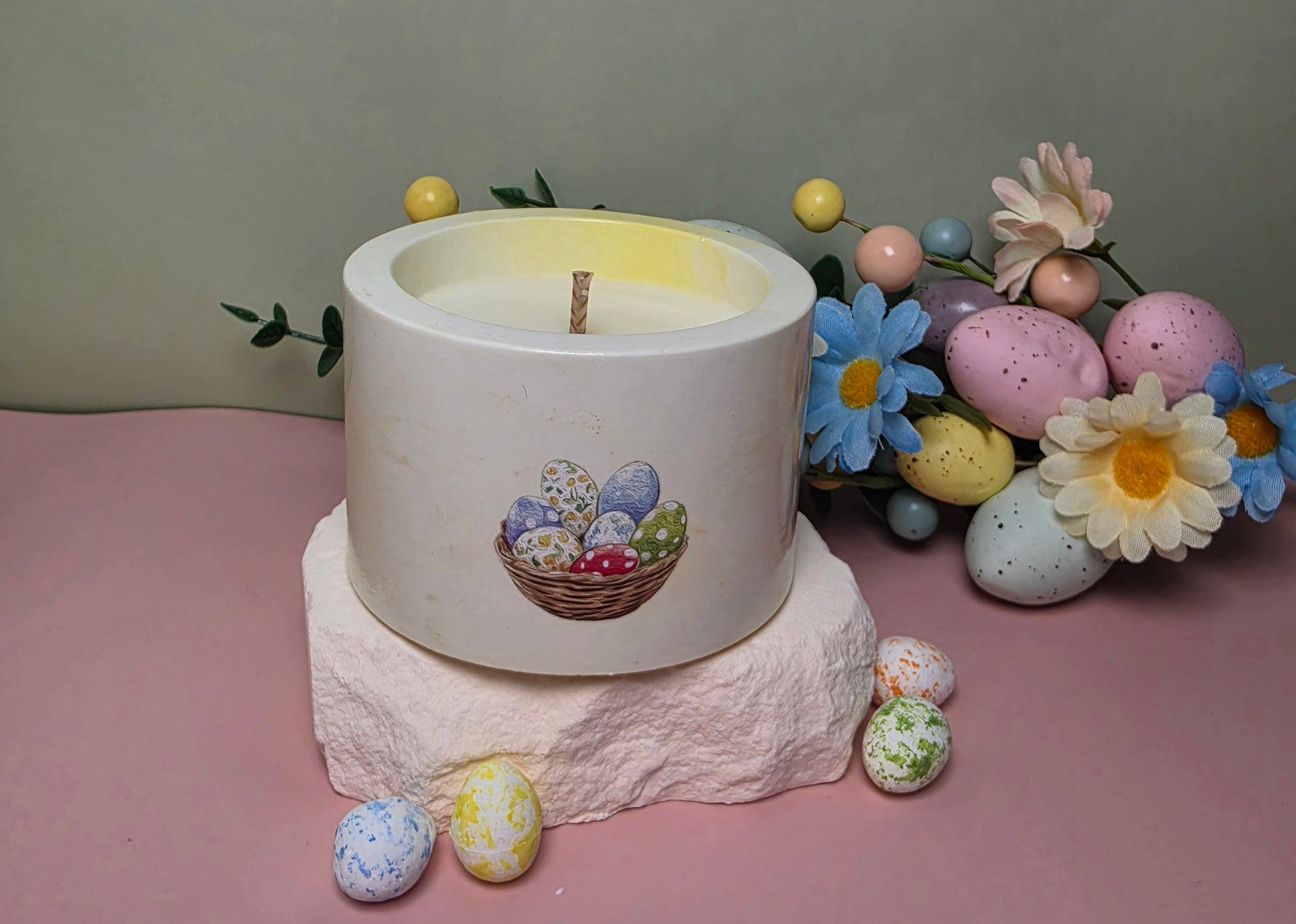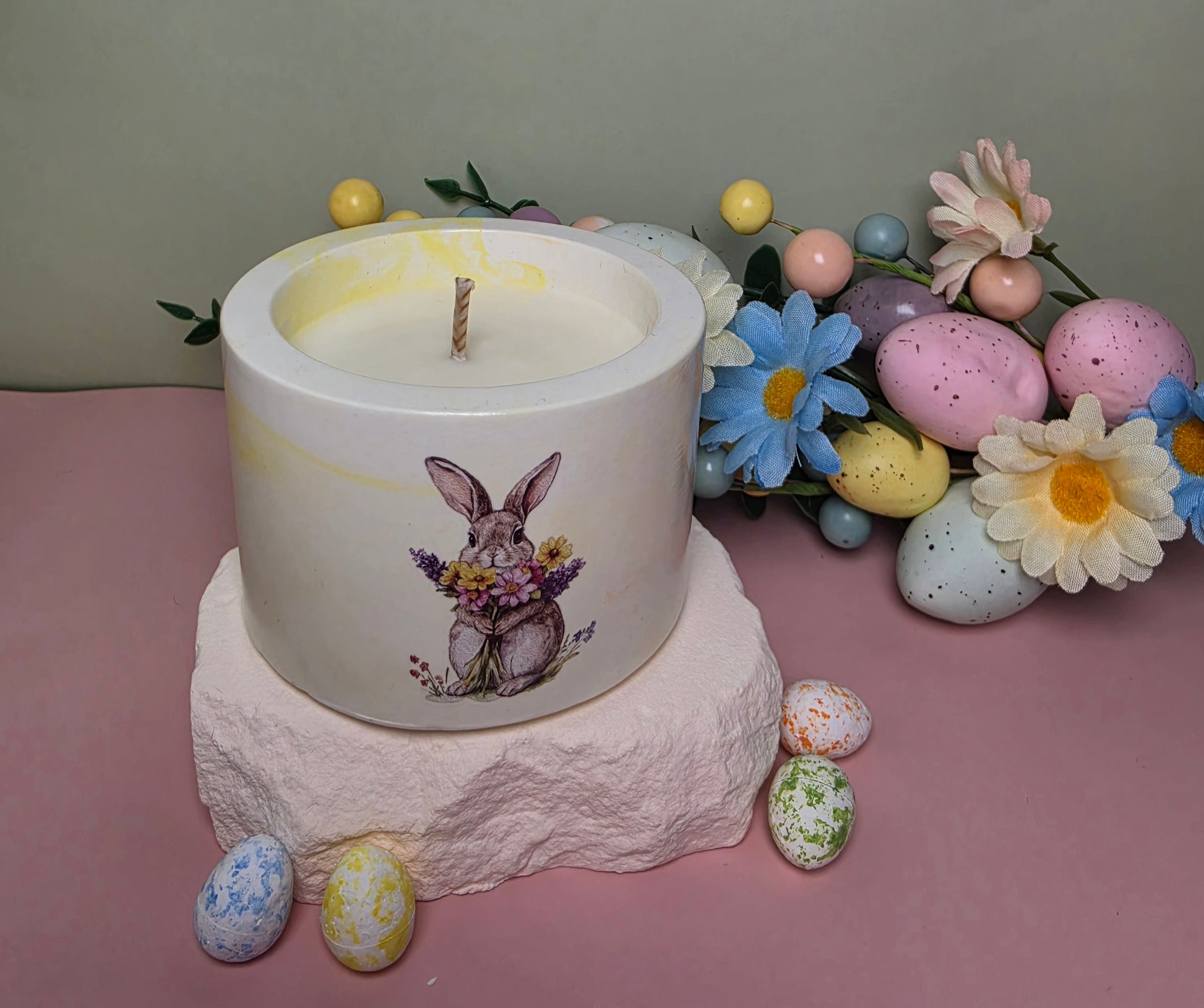 Die Kerze wird aus 96 g natürlichem Sojawachs handgegossen und befindet sich in einem handgefertigten Gipsgefäß, das mit verschiedenen Farben und liebevollen Oster-Motiven dekoriert ist. Dadurch wird jede Kerze zu einem einzigartigen und besonderen Dekorationsstück.