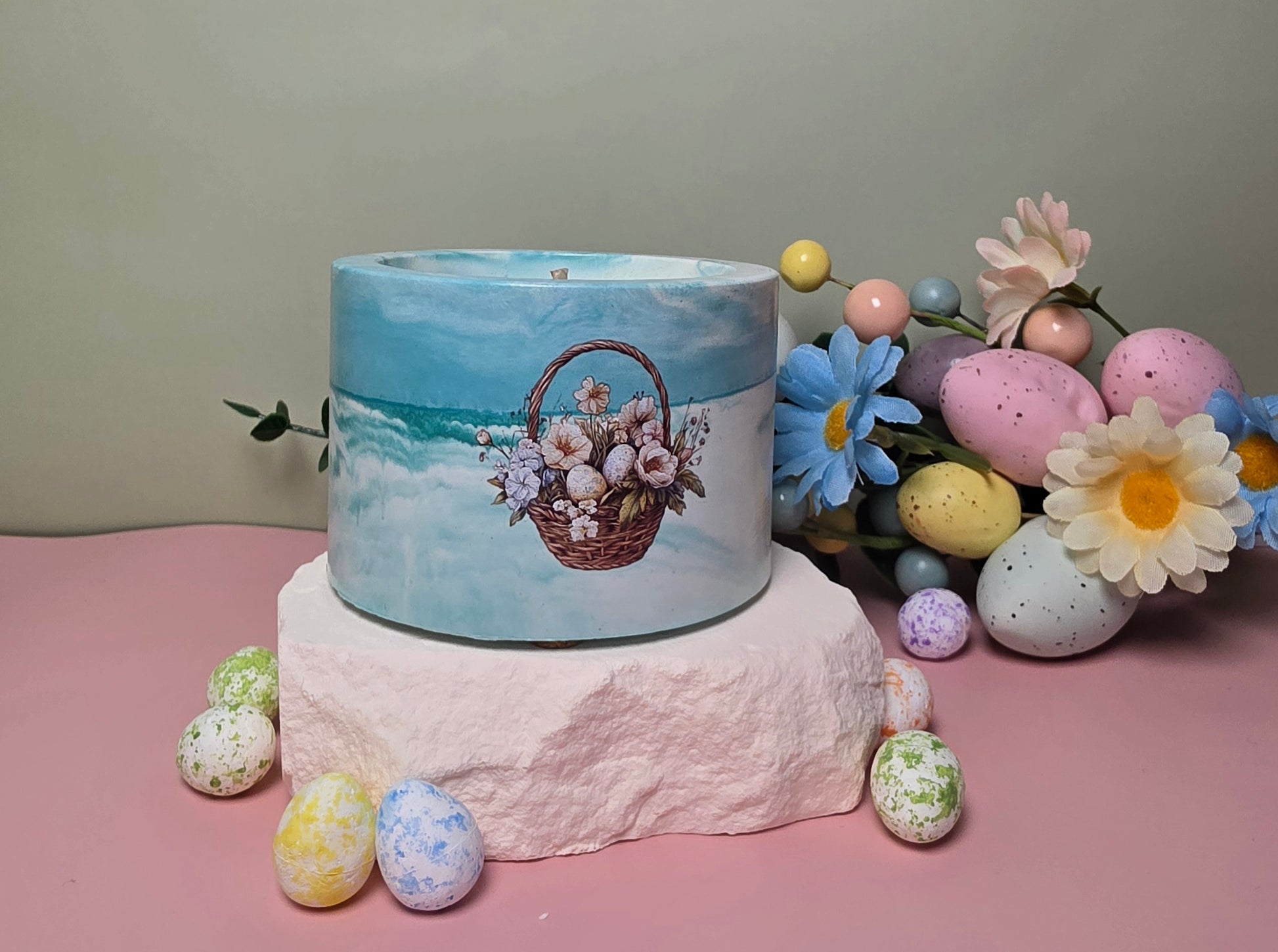 - Handgefertigtes Gipsgefäß mit bunten Osterdekorationen
