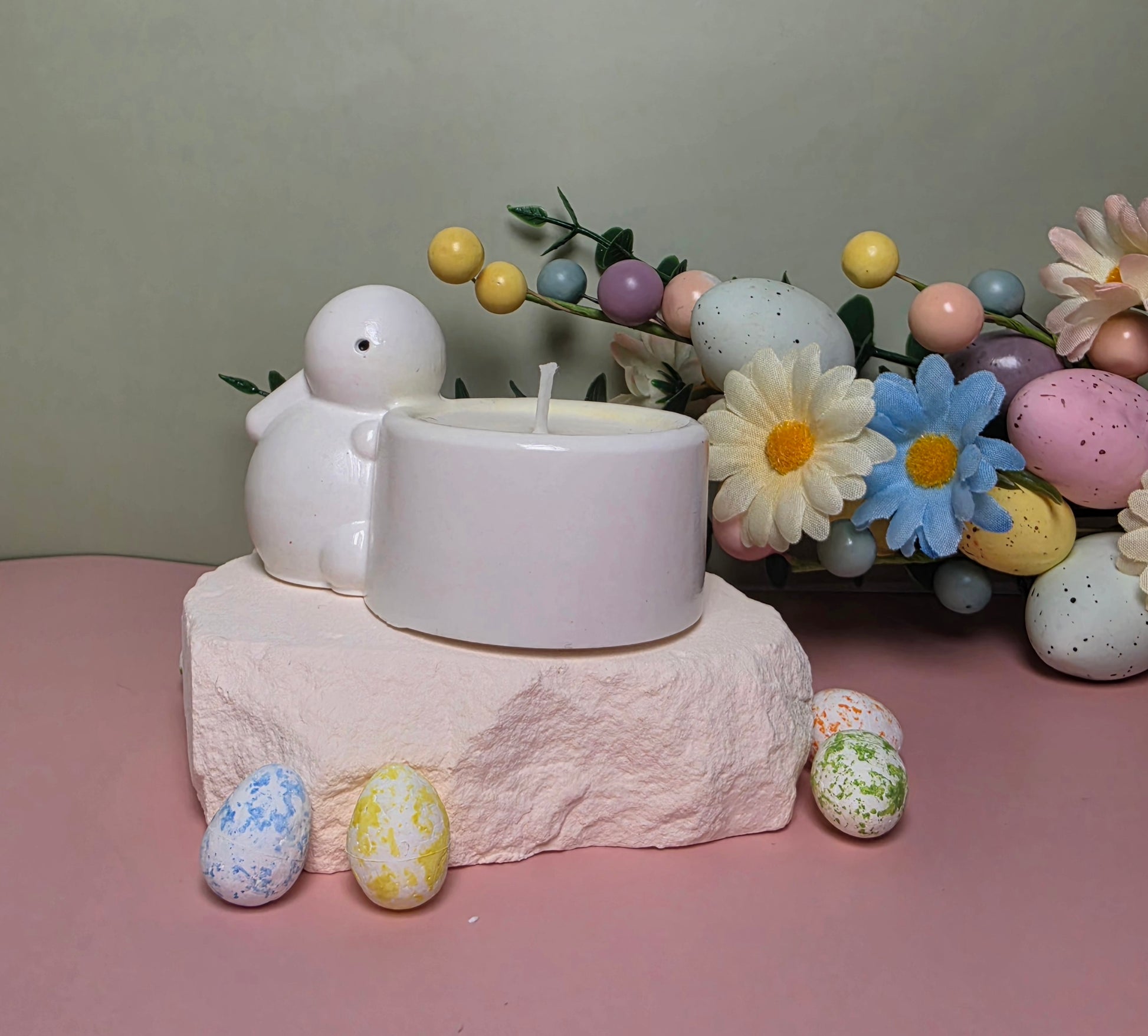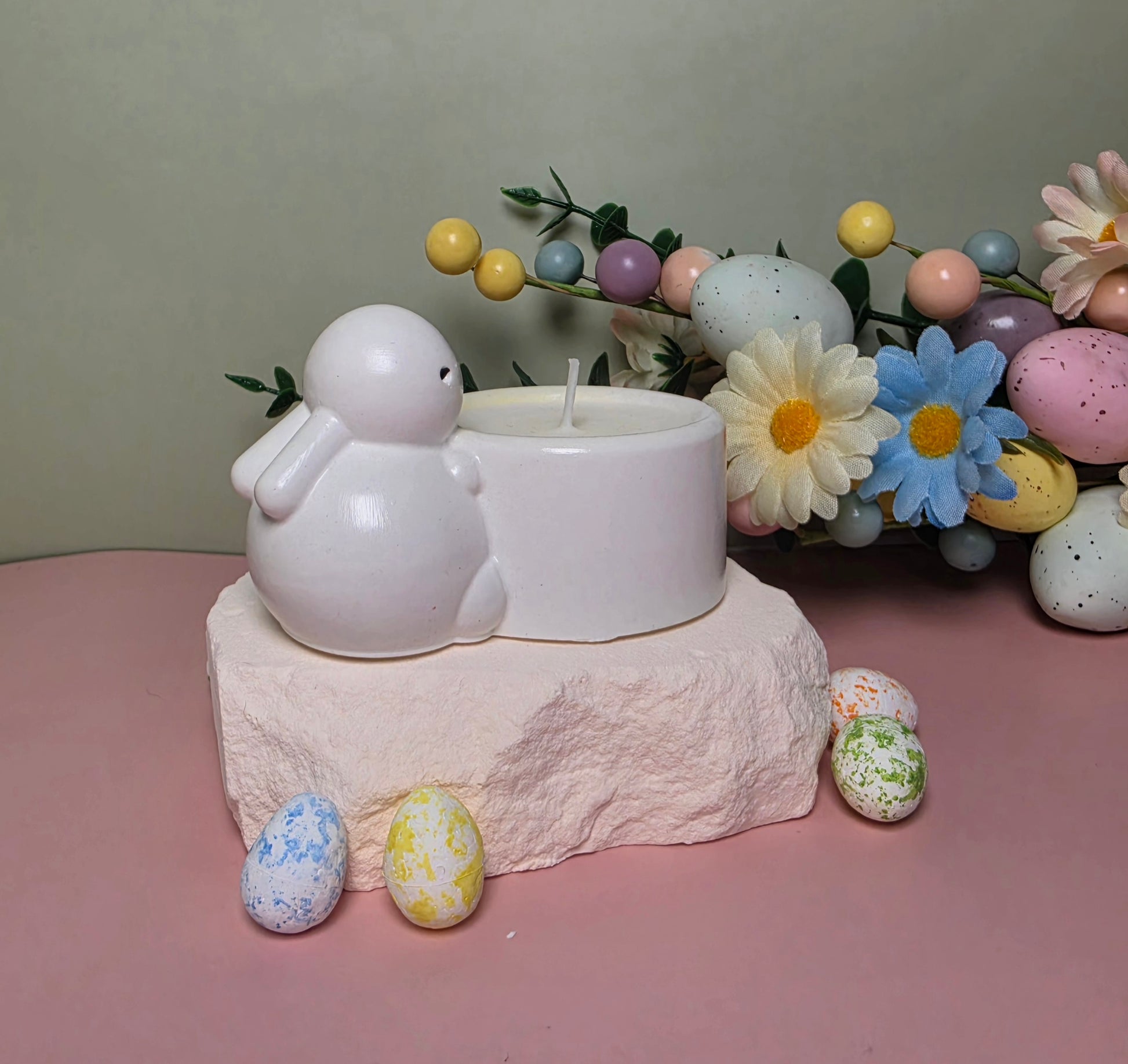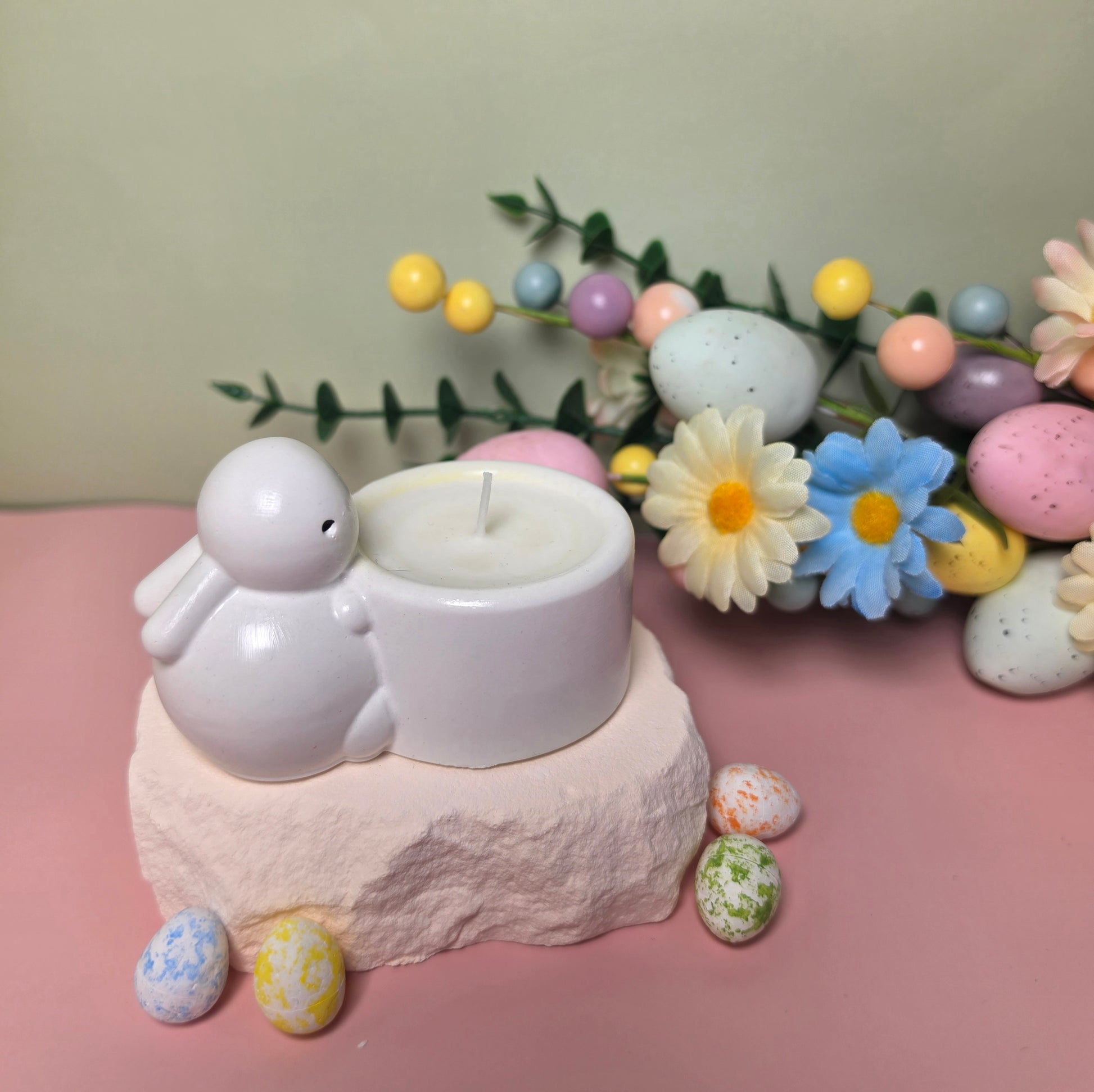 Die Kerze wird aus natürlichem Sojawachs handgegossen und befindet sich in einem handgefertigten Gipsgefäß in Hasenform, das jedem Raum einen charmanten und verspielten Frühlingsakzent verleiht.