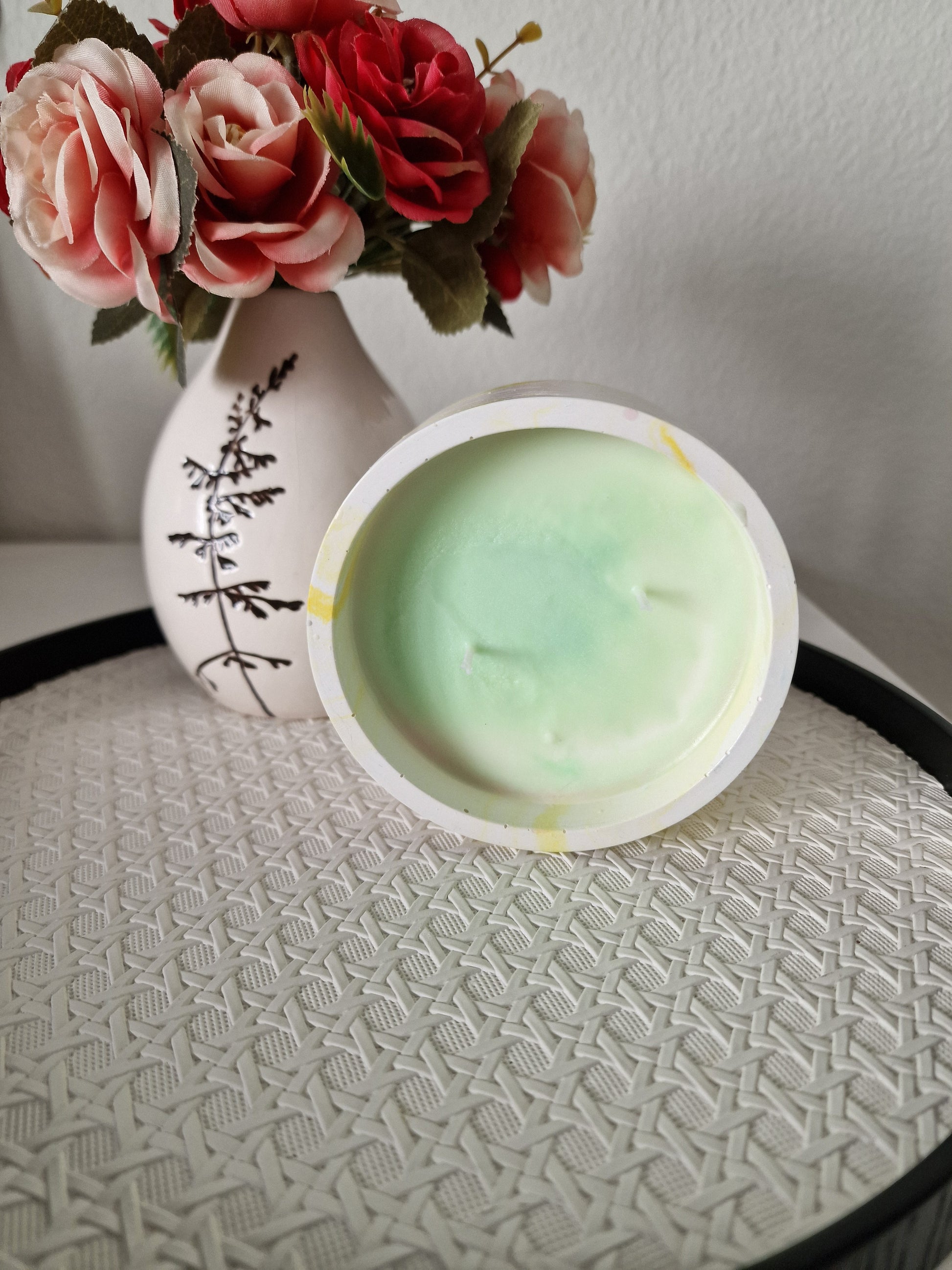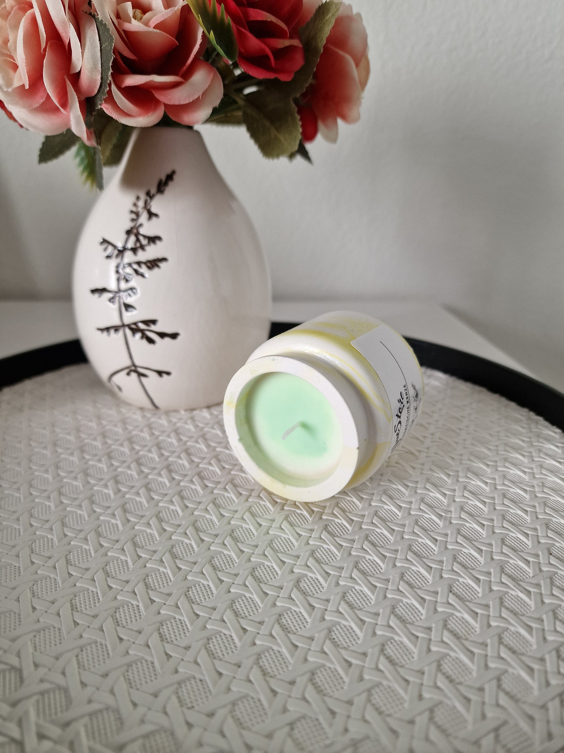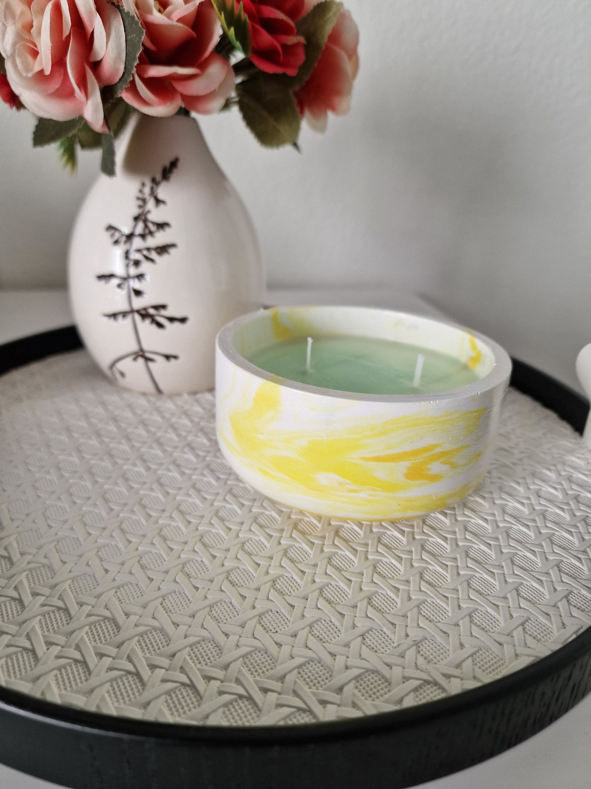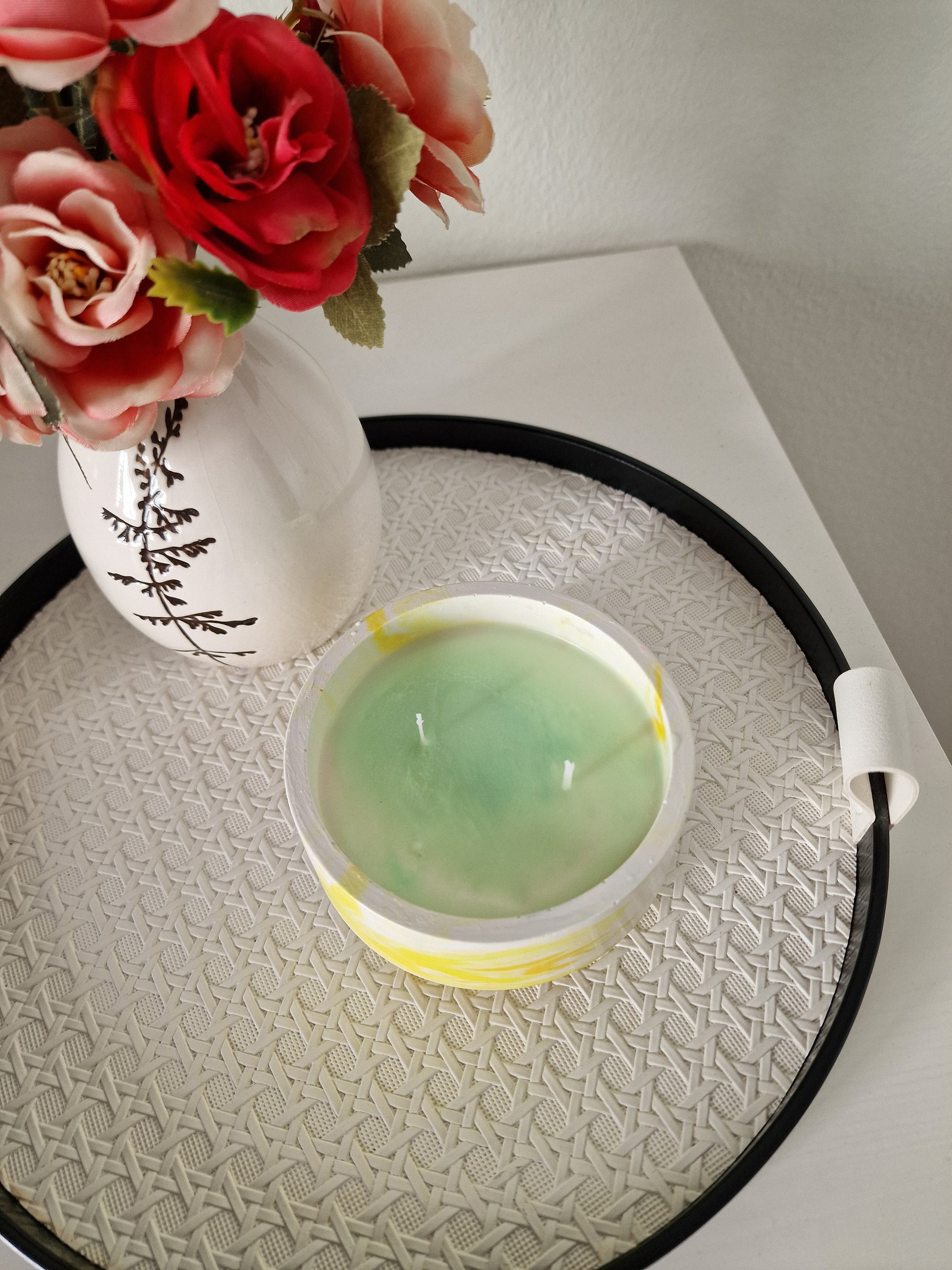 Die Kerze wird in einem von uns handgefertigten Gipsgefäß gegossen, das mit einem modernen zweifarbigen Design in Weiß und Gelb begeistert – ein echter Hingucker für jedes Zuhause.