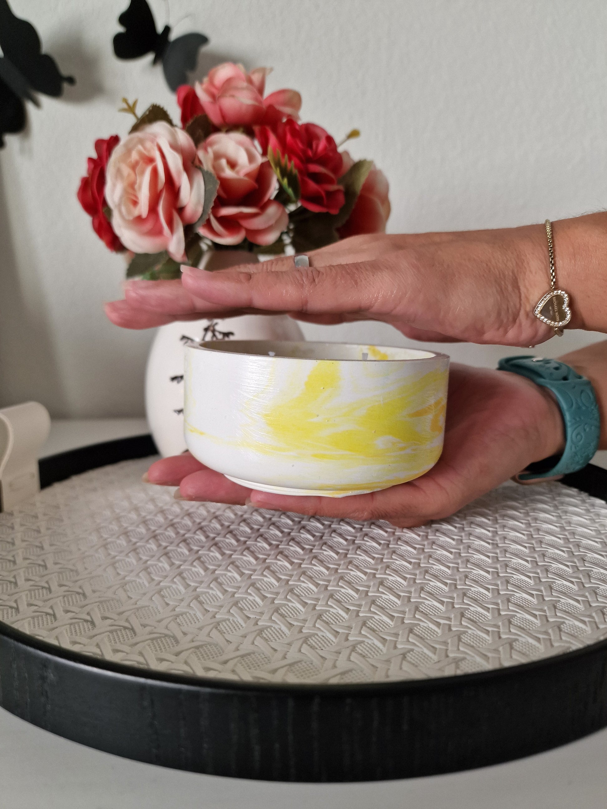 📦 Gegossen in handgefertigtem Gipsgefäß in Weiß & Gelb