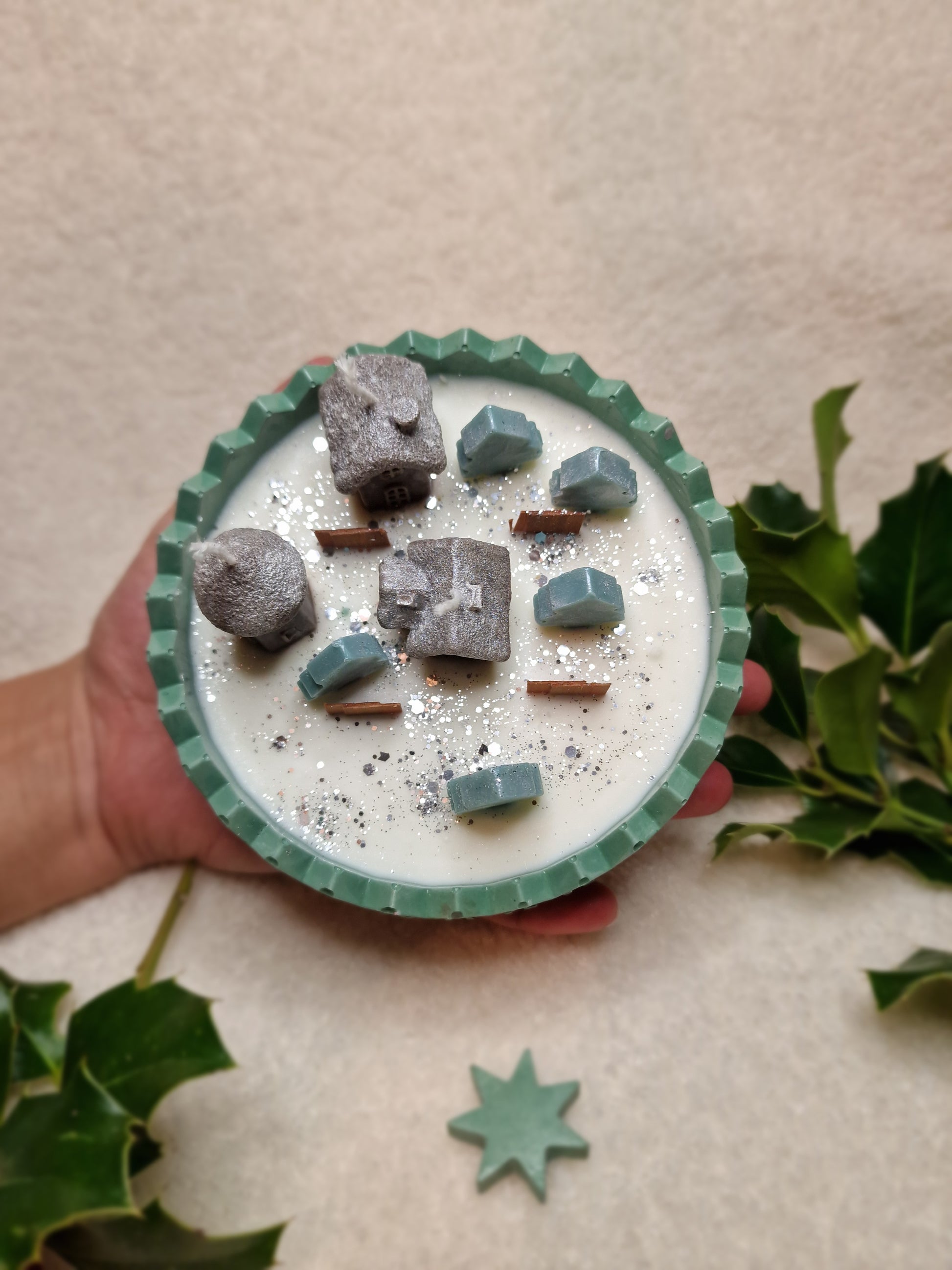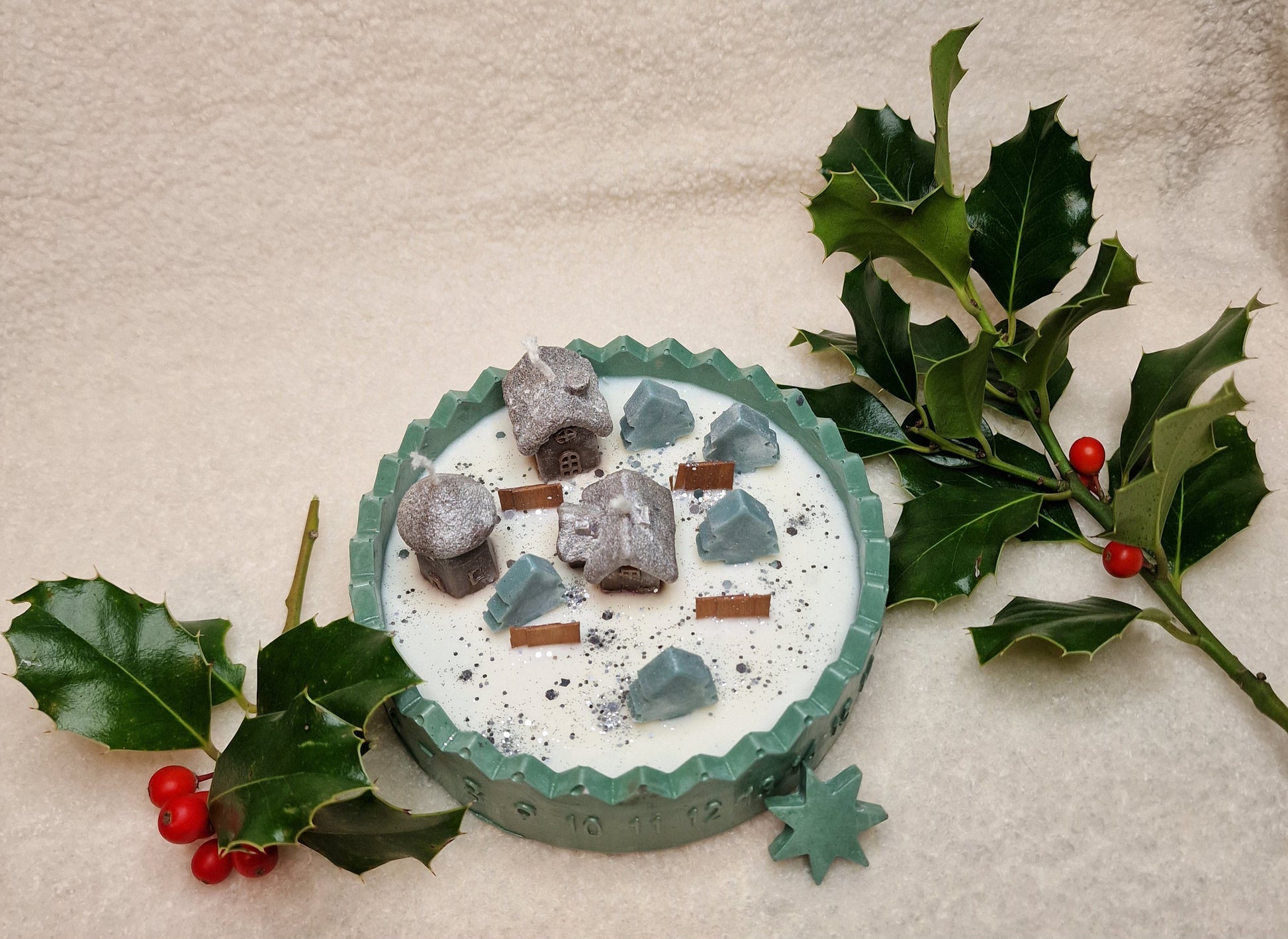 - Dekoration: kleine Figuren in Form von Häusern und Tannenbäumen aus Soja- und Bienenwachs